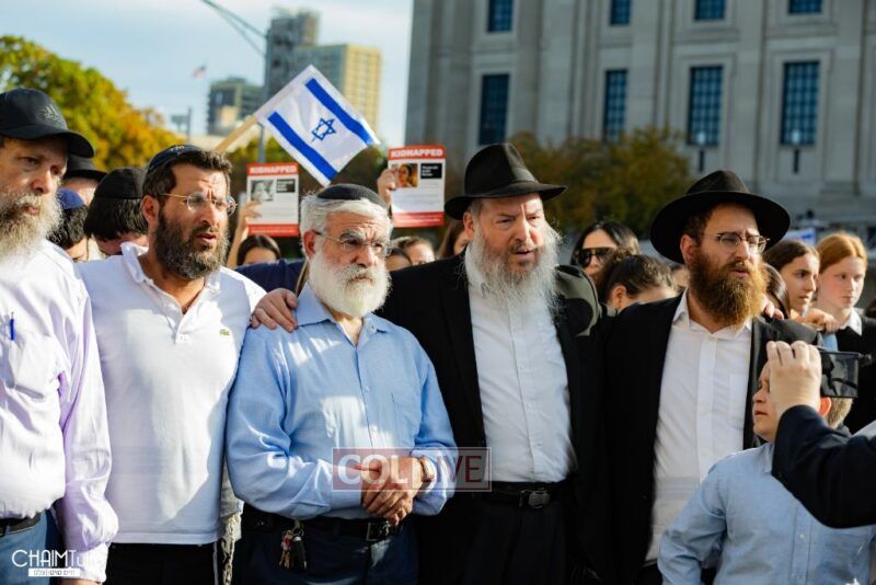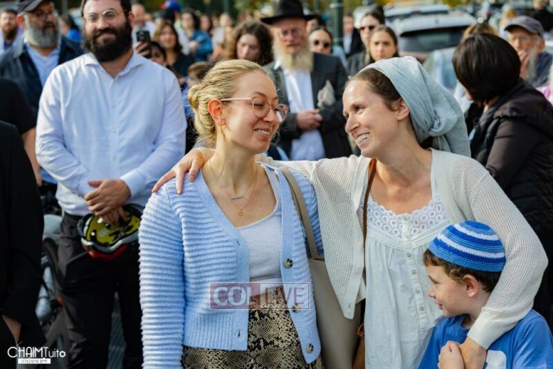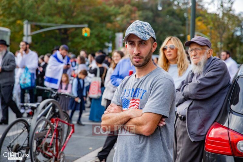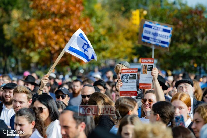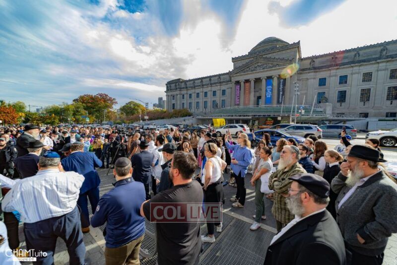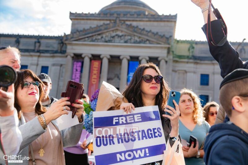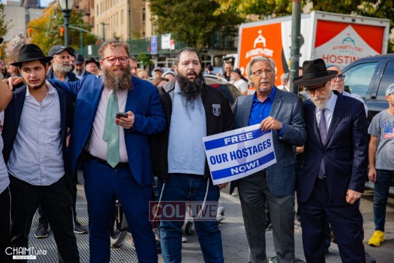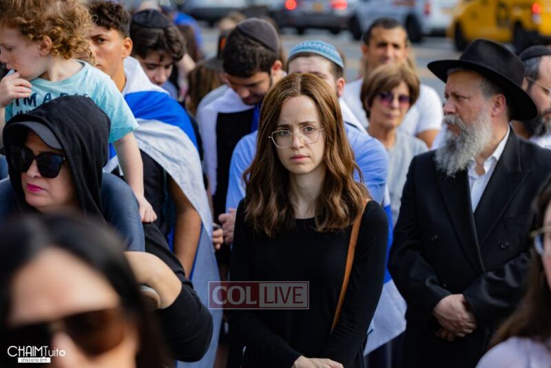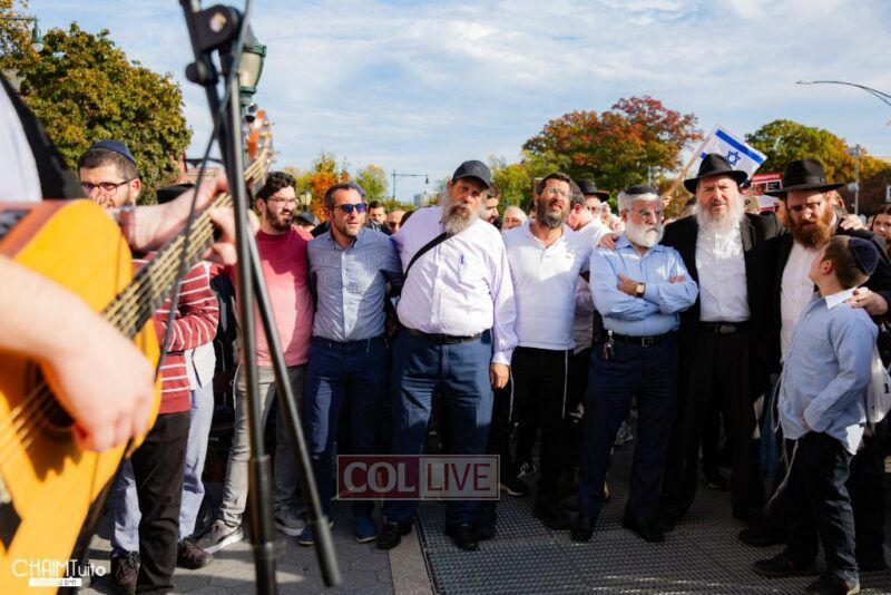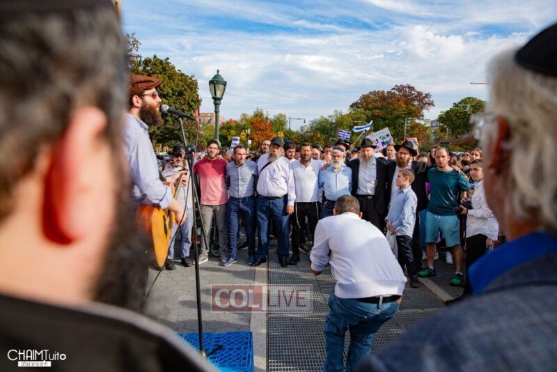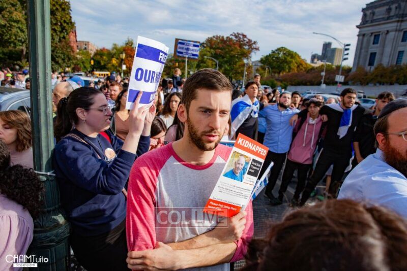 The hundreds joined in song, led by musician Zalmy Schreiber on the guitar, singing “Acheinu” and “Shalom Aleichem,” the prayer sung before the Shabbos meal every Friday night, with the hope and prayer that the hostages will be released home to their loved ones even before the beginning of Shabbos.