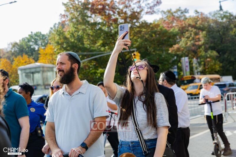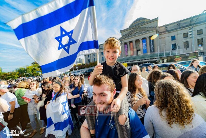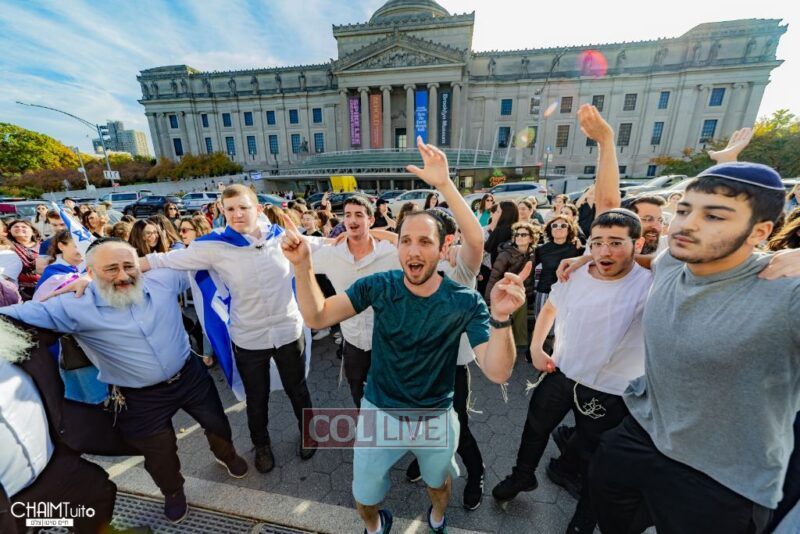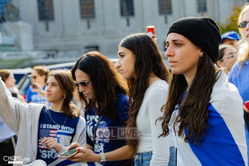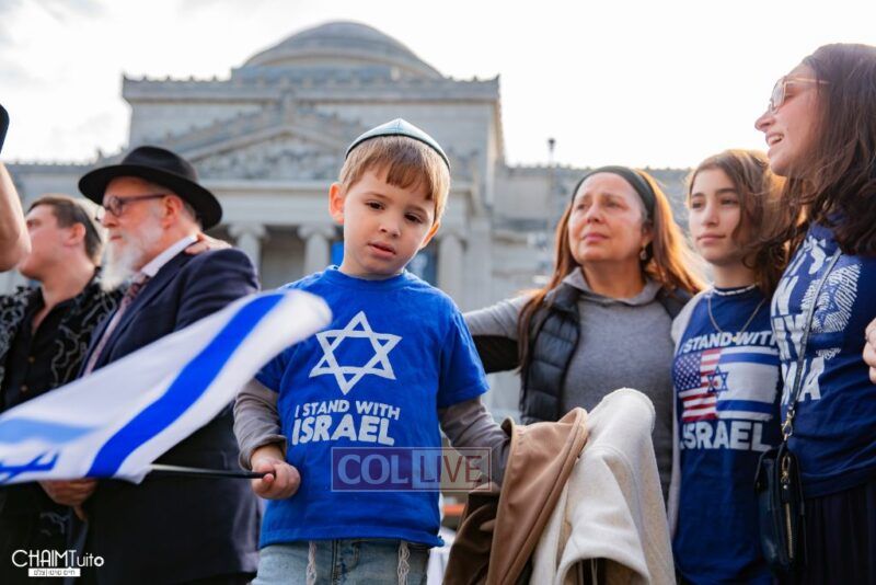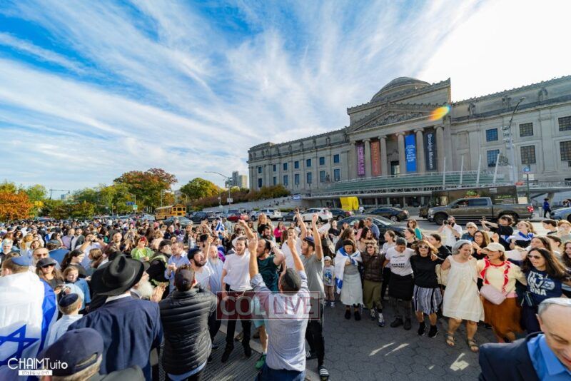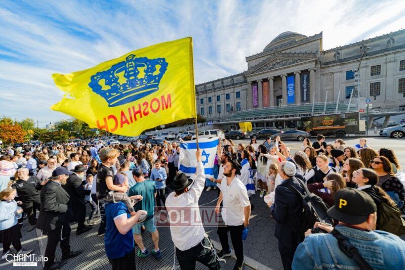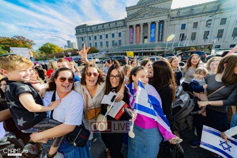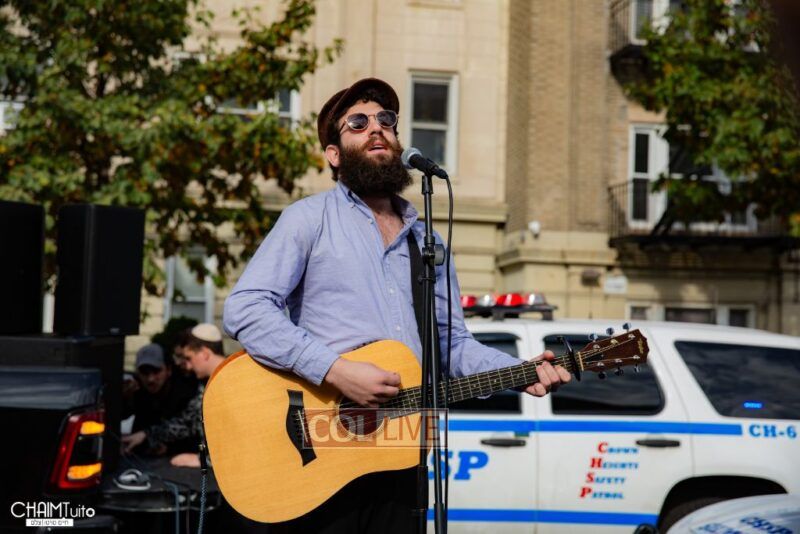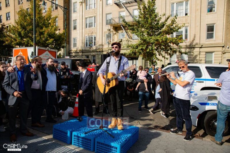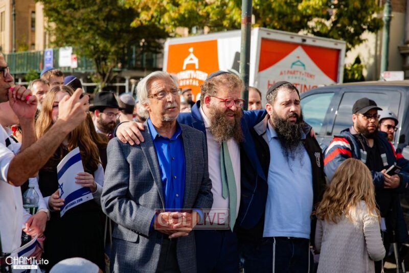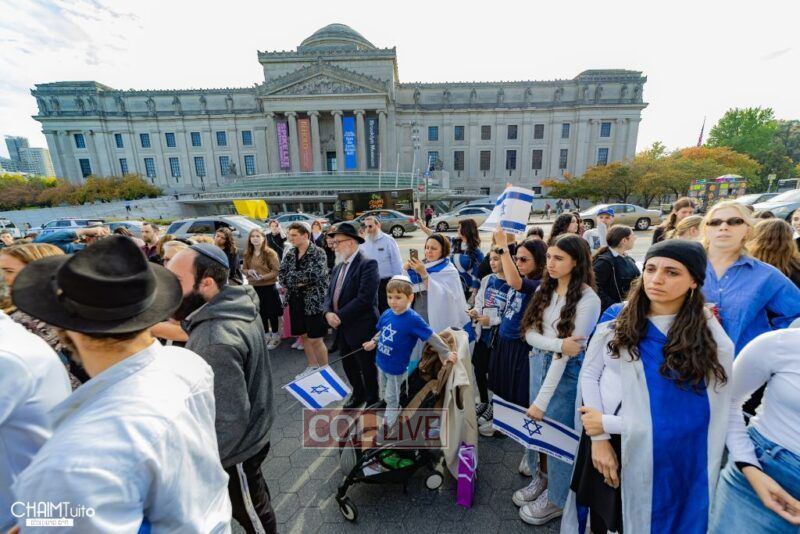The hundreds joined in song, led by musician Zalmy Schreiber on the guitar, singing “Acheinu” and “Shalom Aleichem,” the prayer sung before the Shabbos meal every Friday night, with the hope and prayer that the hostages will be released home to their loved ones even before the beginning of Shabbos.