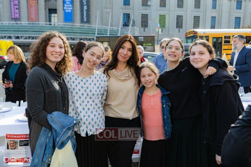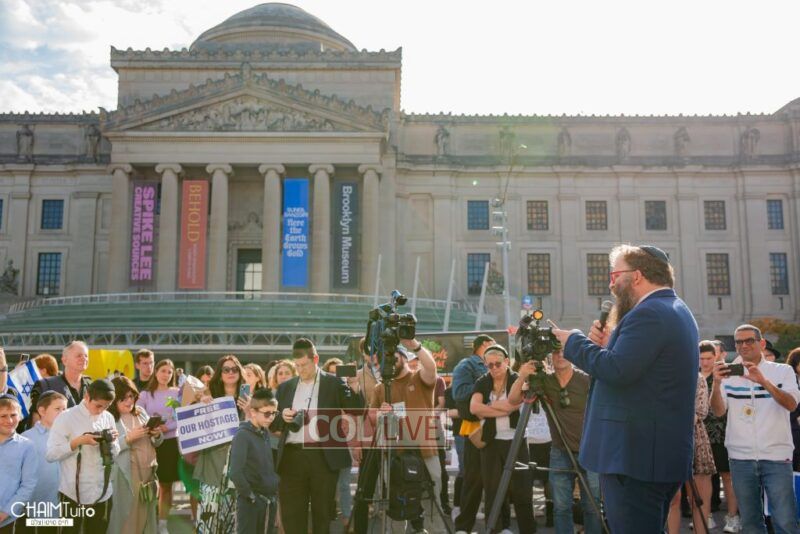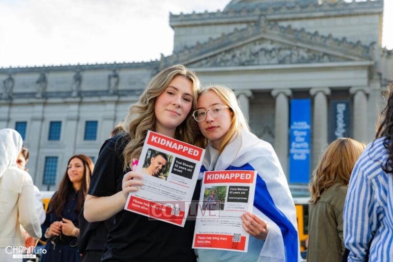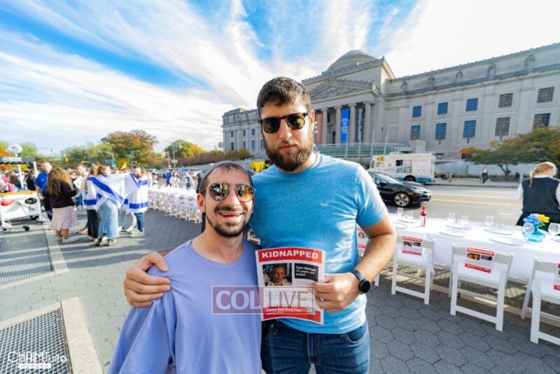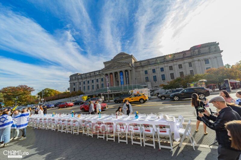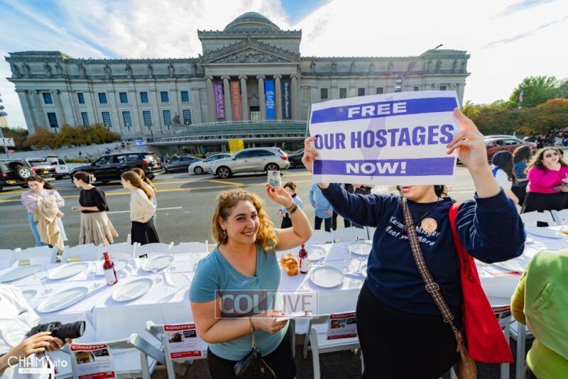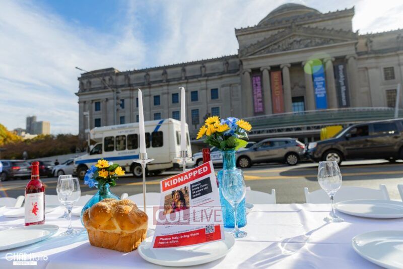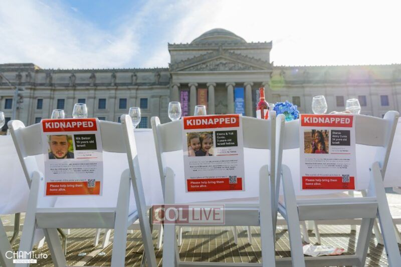 Hundreds gathered for the event on Eastern Parkway near the Brooklyn Museum, which featured a fully set Shabbos table with over 222 empty chairs, to demand the hostages’ immediate return.