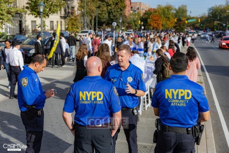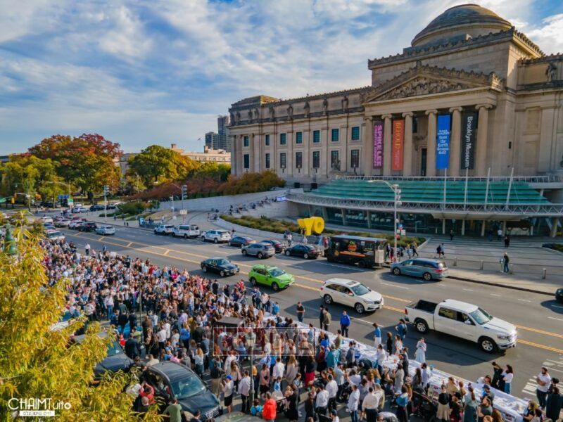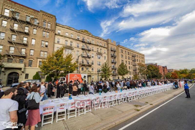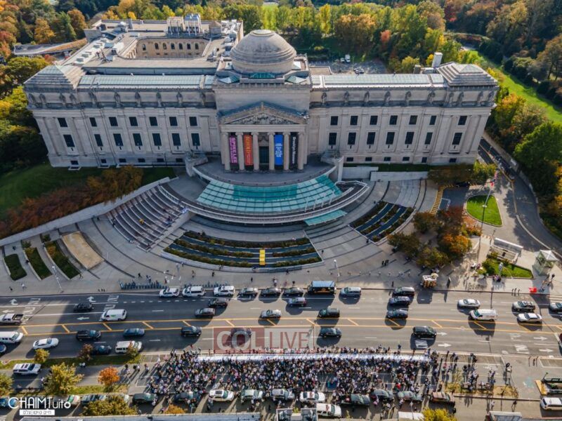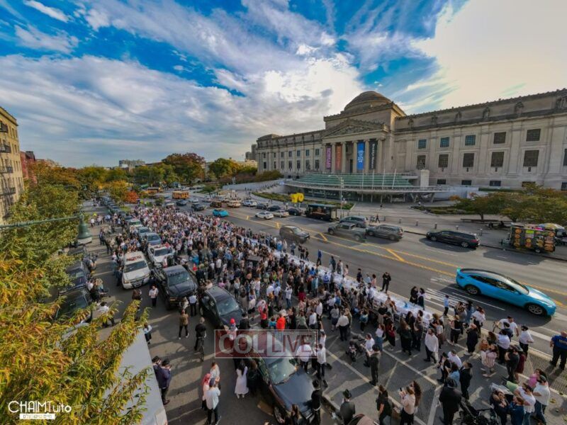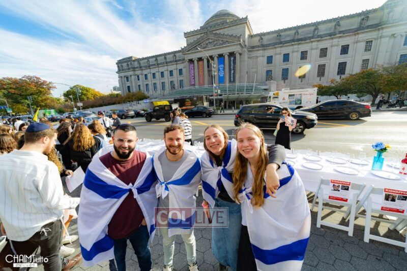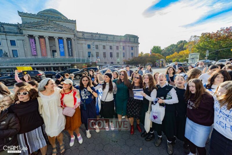 Hundreds gathered for the event on Eastern Parkway near the Brooklyn Museum, which featured a fully set Shabbos table with over 222 empty chairs, to demand the hostages’ immediate return.