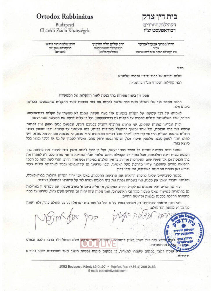 Rabbi Baruch Oberlander, Chief of Budapest’s Orthodox Rabbinate and Head Shliach of Hungary, instructed that the shuls in the country should remain closed.