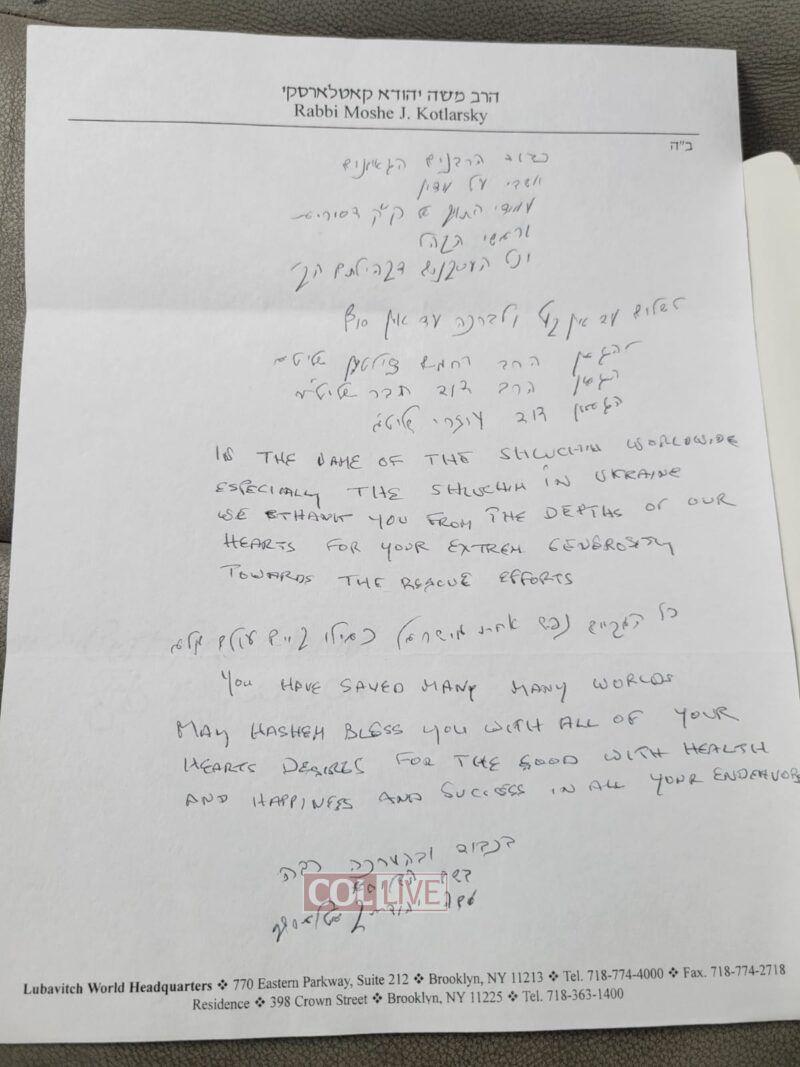 Rabbi Moshe Kotlarsky, Vice Chairman of Merkos L’inyonei Chinuch which oversees the network of Chabad Shluchim worldwide, wrote a personal note to the rabbis behind the operation.
