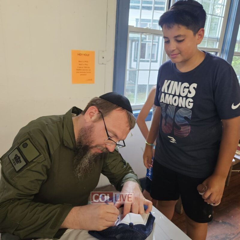 The campers sat spellbound. One camper, visibly emotional, raised his hand and said, “Rabbi, I want to hug you. I’m so proud of you.” The two embraced, a moment filled with Jewish pride and achdus. Rabbi Goldfarb shared military patches and even gifted his personal IDF cap and green tzitzis to campers who accepted hachlatos, such as wearing tzitzis every day or putting on tefillin regularly.