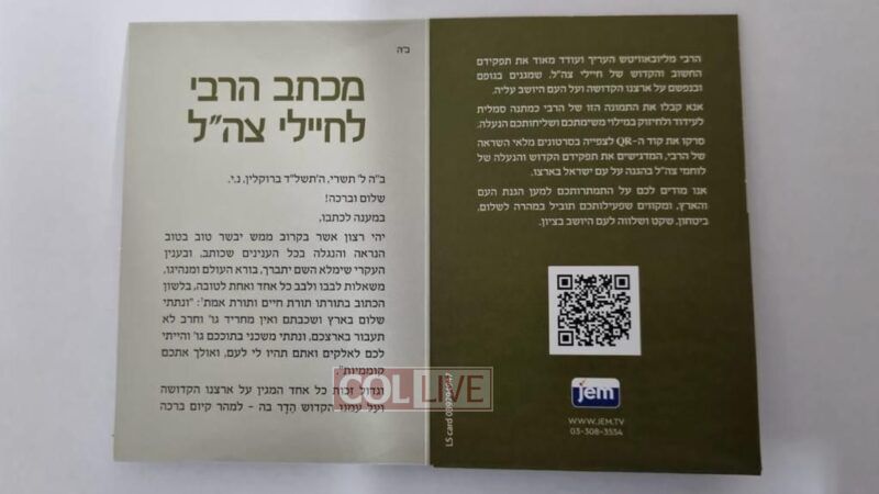 The card contains a QR code linking to a specially-curated video playlist showcasing the Rebbe’s words of encouragement and blessings for the soldiers—conveying the Rebbe’s actual words and voice to those undertaking the most significant responsibility in the world during these challenging times.