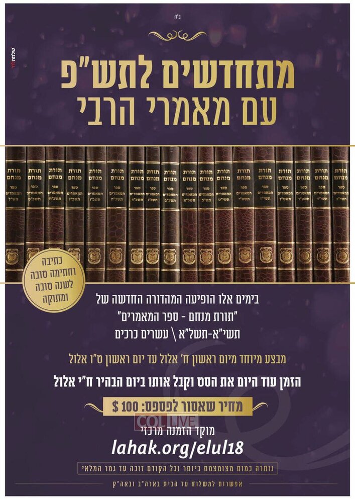 The new Seforim, Toras Menachem vol. 66 and Sefer Maamarim 5739, are available for purchase on Lahak’s website – www.lahak.org/sale, operated with dedication by the staff of Chabad.org, a division of the Chabad-Lubavitch Media Center headed by Rabbi Zalman Shmotkin, most notably Rabbi Meir Simcha Kagan, who spends endless hours providing his professional input for the hafotzo of the Rebbe’s Sichos and Maamarim throughout the year.
