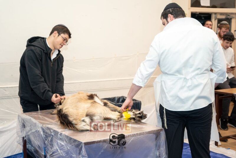 The project involved the purchase, Shechitah, Kashrus, salting, cooking, and consumption of a goat, with the Shechitah being performed by the Smicha Menahel, Rabbi Menachem Mendel Cunin, Shu”b. Rabbi Cunin began the lesson by teaching the Bochurim about the various Chalafim used for Shechitah, the widely accepted opinion of the knife according to the Alter Rebbe, and the significance of Shechitas Lubavitch. Throughout the process, Rabbi Cunin involved many of the Bochurim, narrating and explaining the various Halachos at play. This included having Bochurim feel the kashrus of the lungs, get a chance to watch it fill with air and ensure they are Glaat.