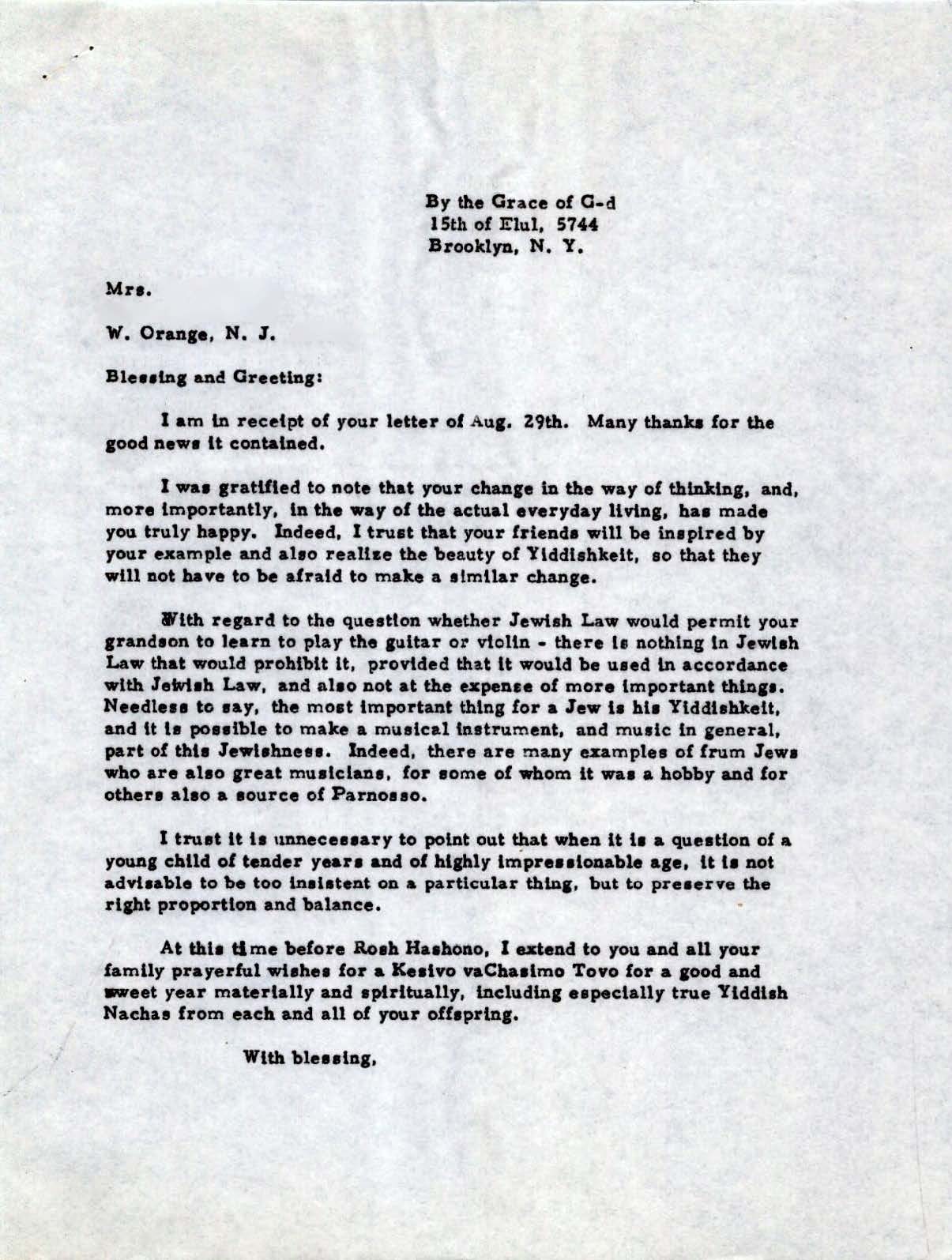 The letter is in response to a caring grandmother looking to arrange music lessons, (guitar or violin), for her grandchild. In her letter, she asks the Rebbe if this would be halachically permissible.