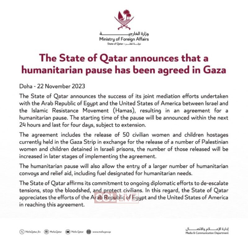 In exchange, Israel has committed to a ceasefire, lasting at least four days, marking the first ceasefire since the outbreak of the war.