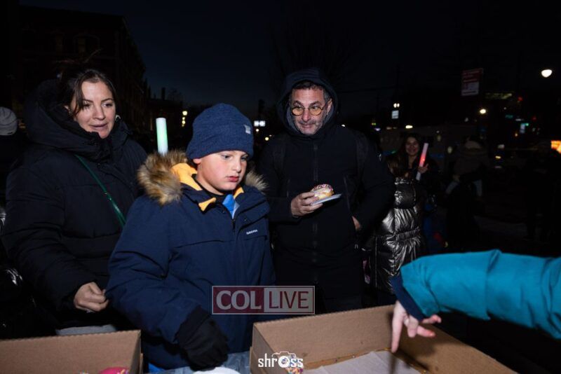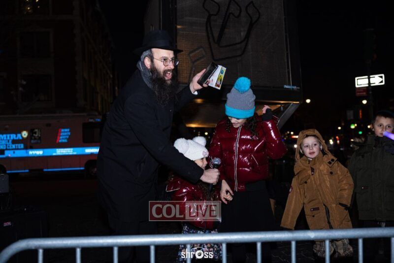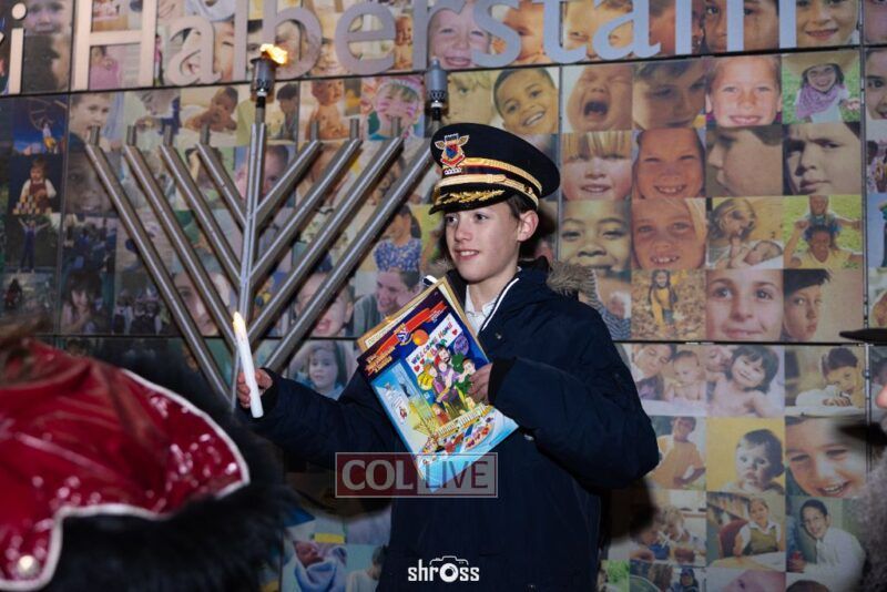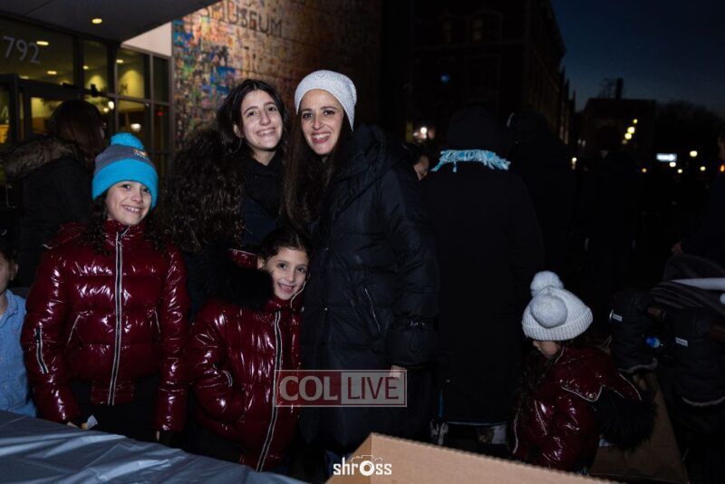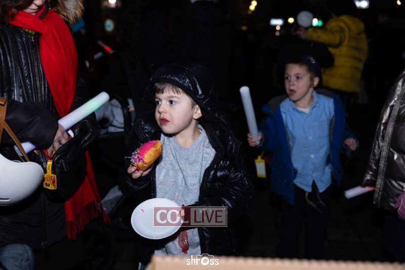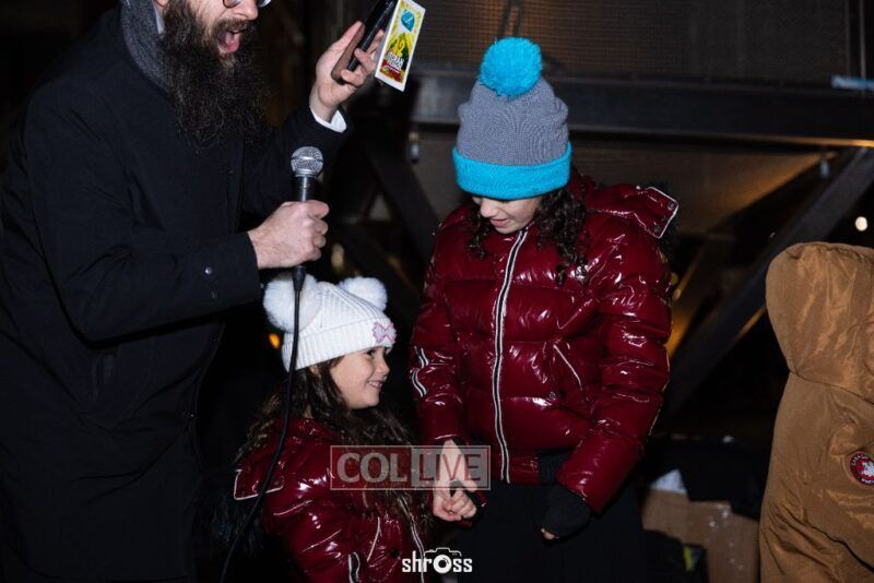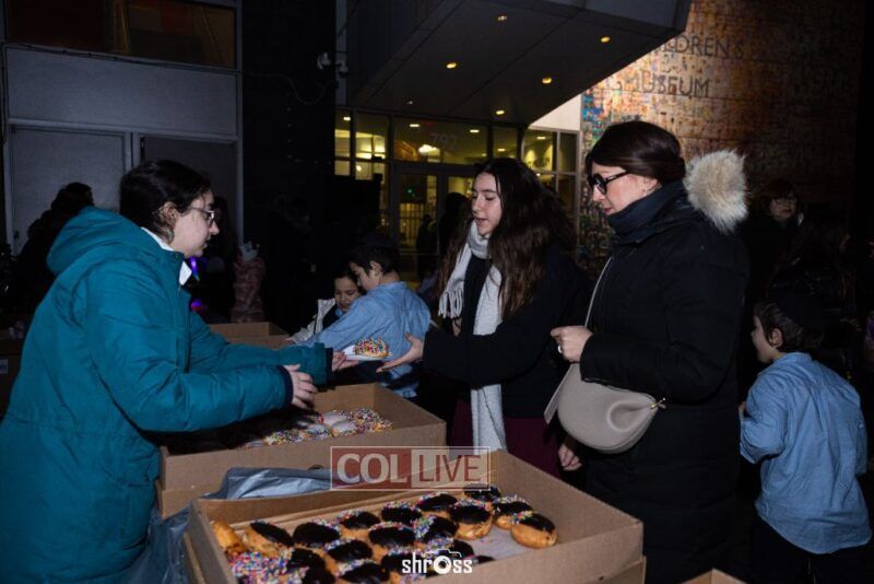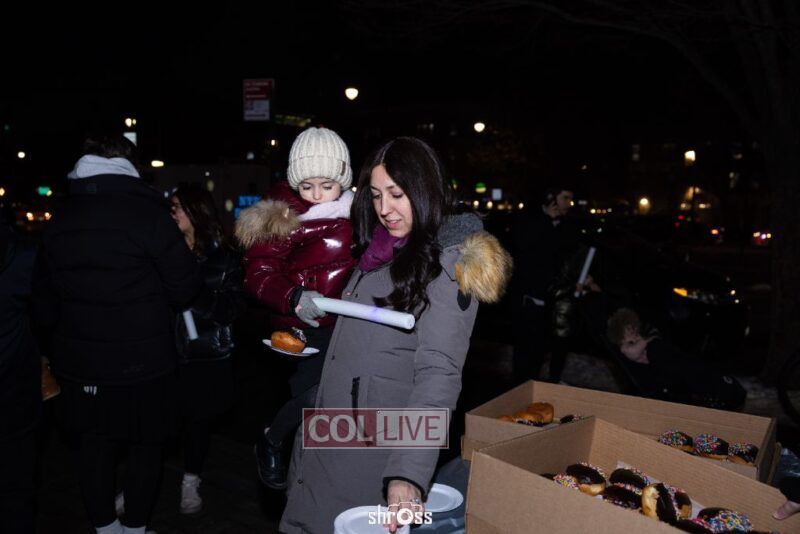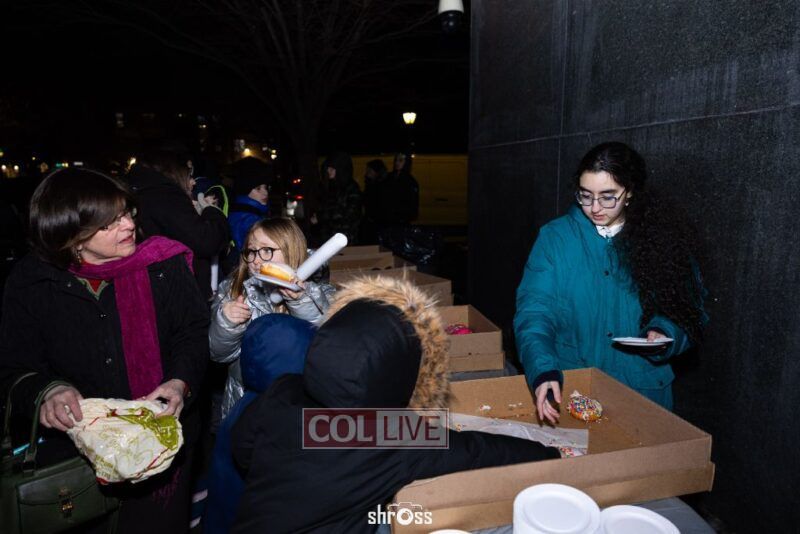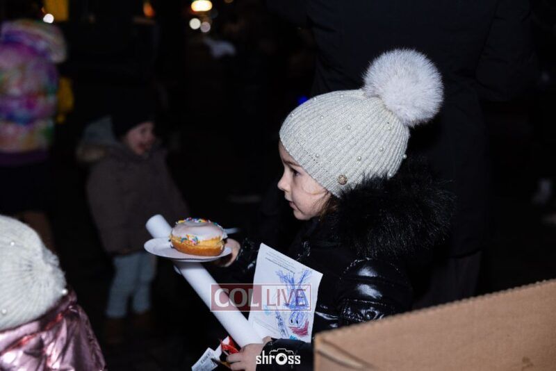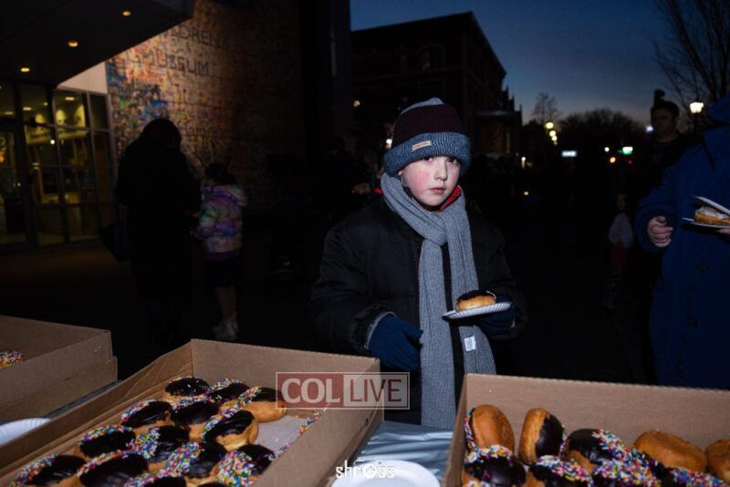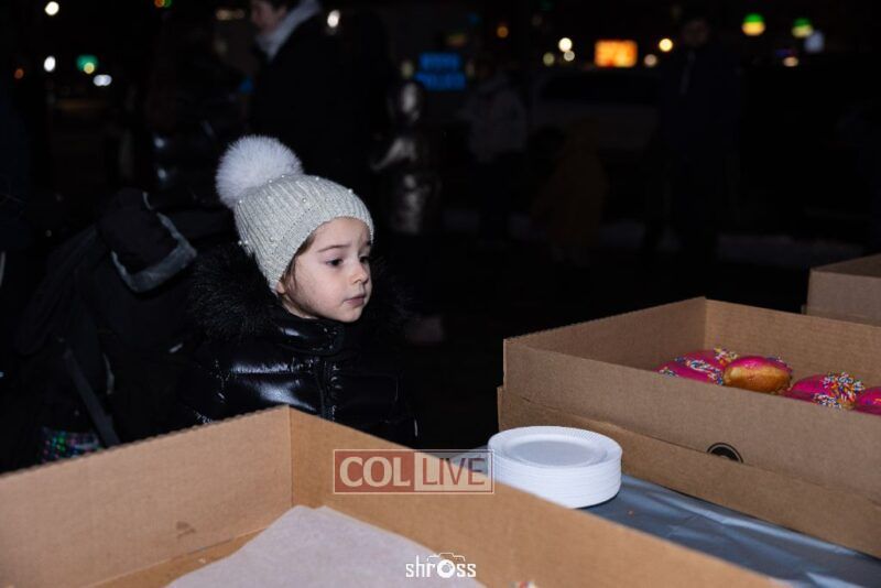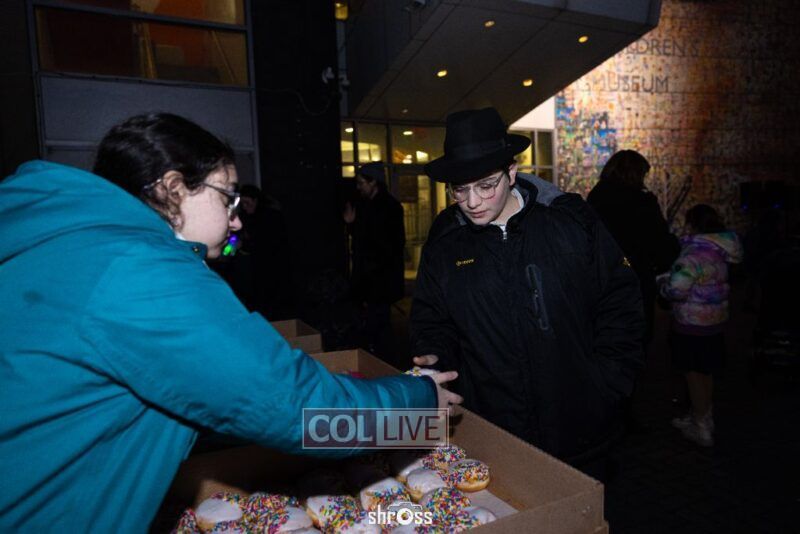 Families gathered on the Plaza at the Jewish Children’s Museum on the first night of Chanukah for a community Menorah lighting with entertainment, music and donuts. Photos