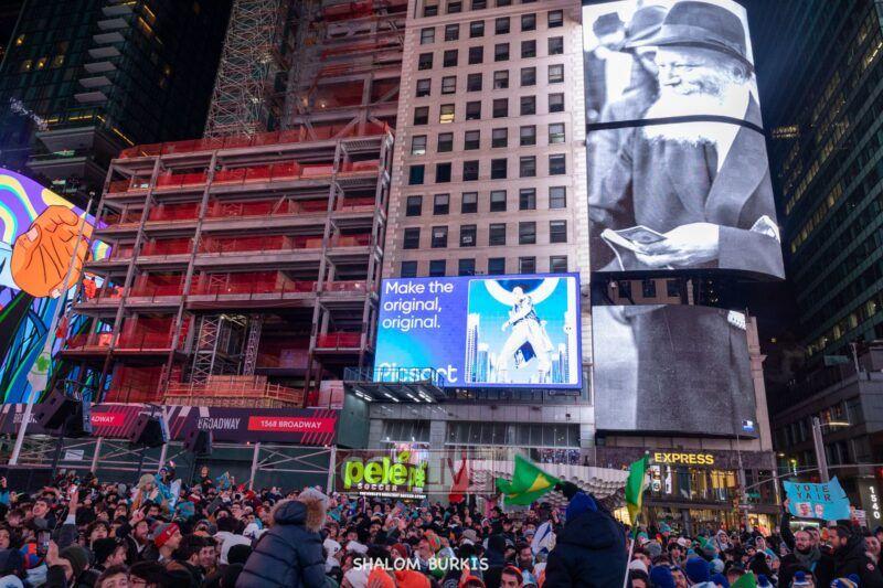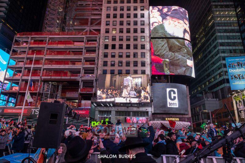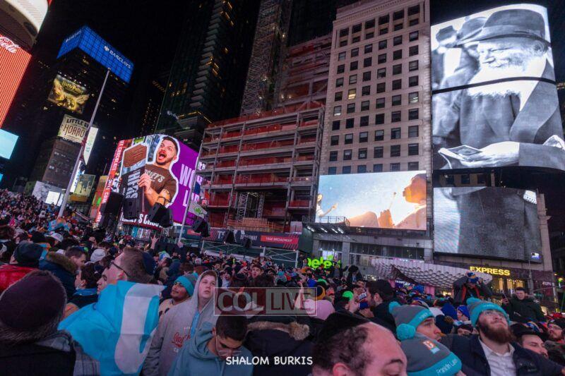 Videos and photos of the Rebbe seen on the Jumbo screens surrounding the event, and the blaring Jewish music caused thousands of passersby to stop in their tracks.