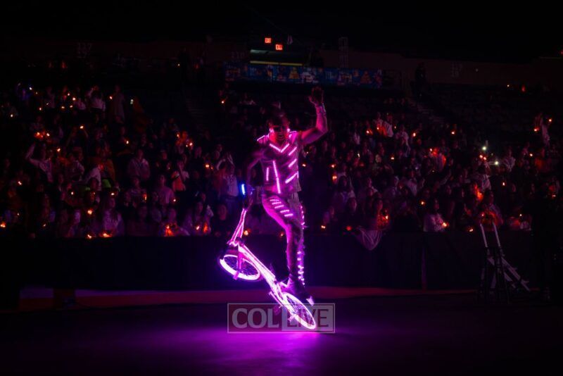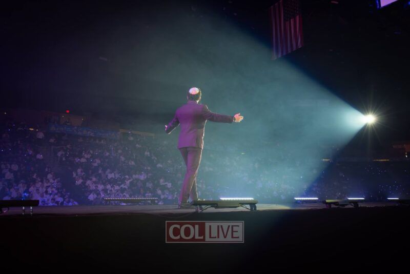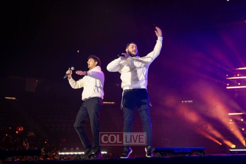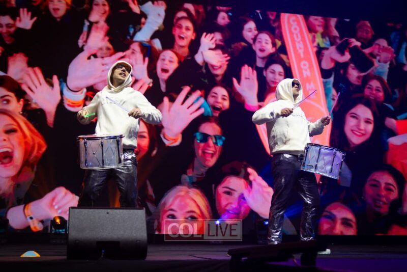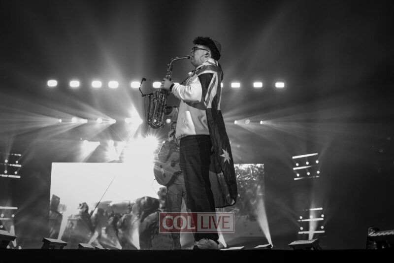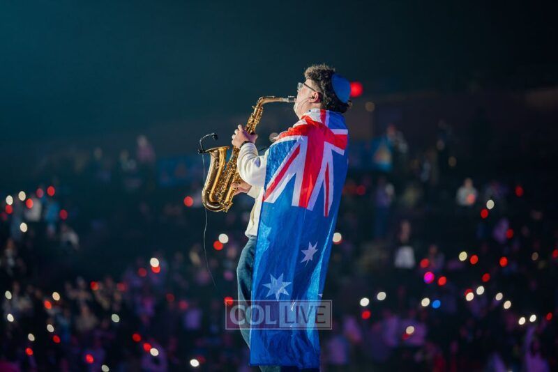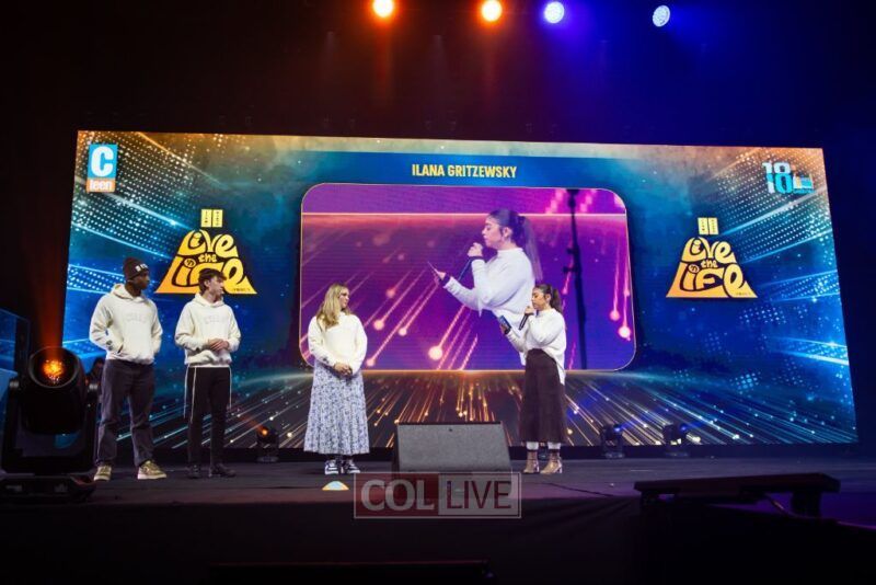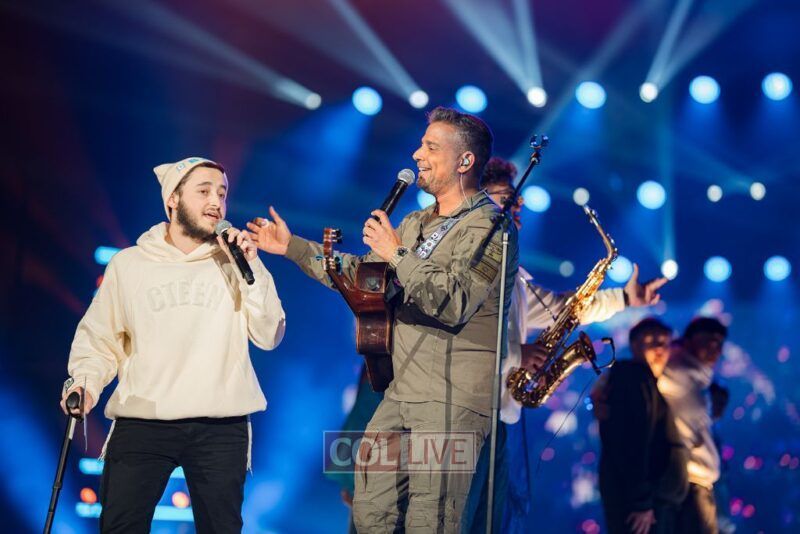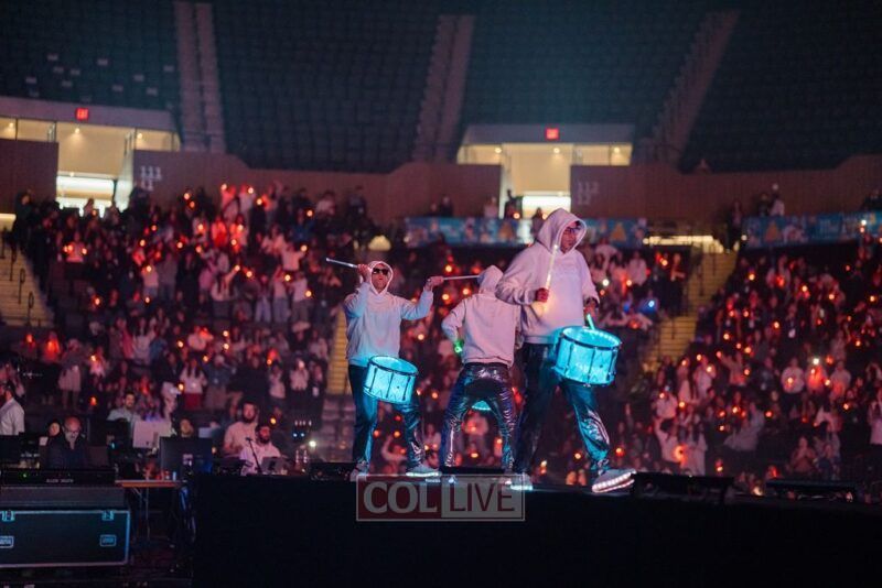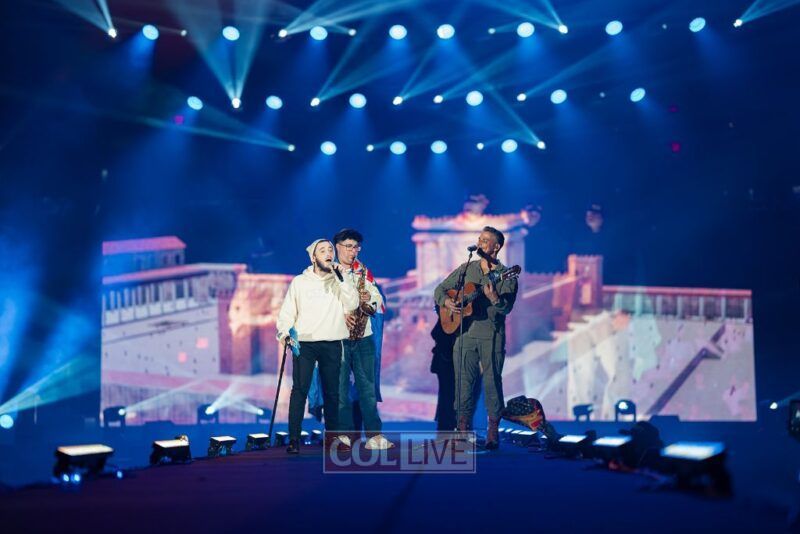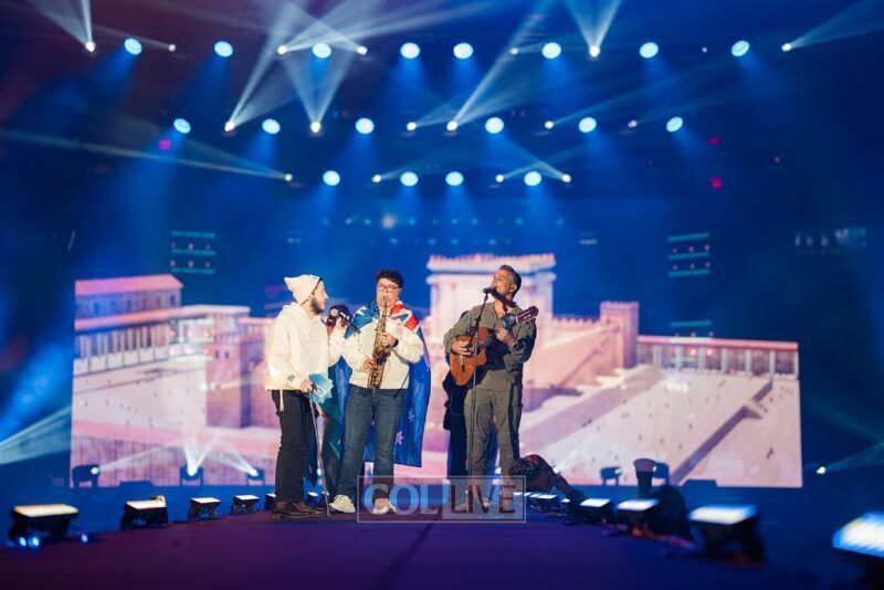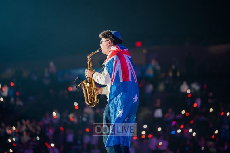 Then the energy shifted. A video appeared on the screens showing Leibel Lazaroff, the young man shot during the Bondi Beach Chanukah attack, playing “Ani Maamin” on his guitar. Noam Buskila introduced teens from Sydney, including David on the saxophone, all personally impacted by the attack. And then, the surprise, Leibel himself walked out from behind the stage