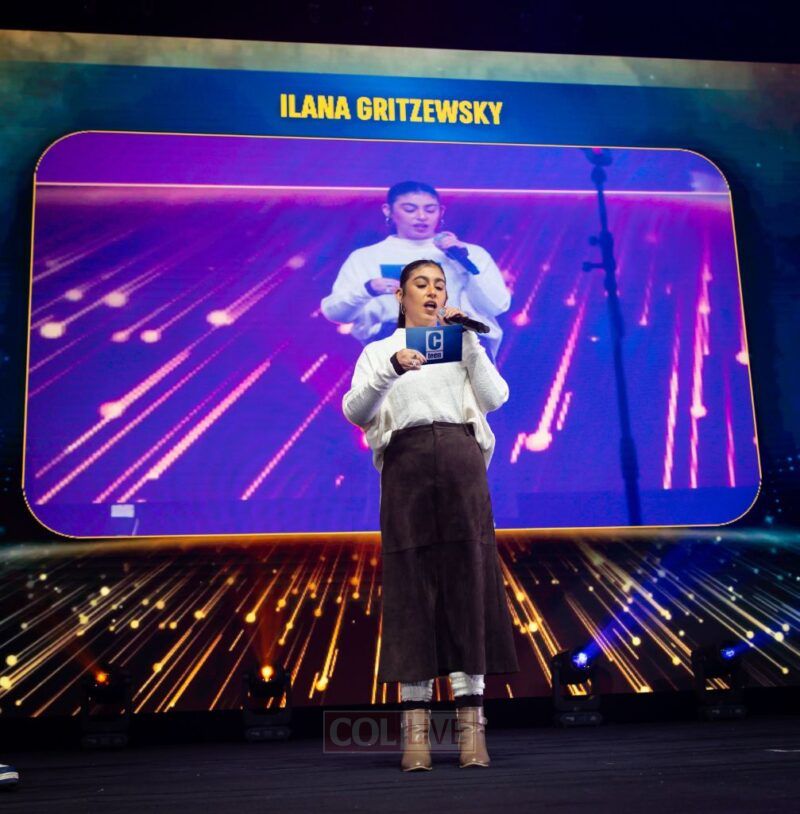Former Israeli hostage Ilana Gritzewsky presented the Az Kanamer Award to teen athletes Michael Shapira, Scarlet Gurevich, and Justin Schoen. Gritzewsky spoke about the courage it takes to choose Jewish identity. “You don’t have to be stripped of everything like I was to discover your neshamah,” she told the teens. “It’s already inside you, alive, powerful, and waiting to be heard.