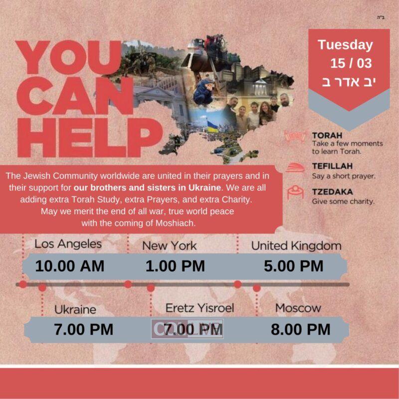 Tuesday, March 15 at 1 pm ET, Jews around the world will unite in Torah, Tefillah and Tzedaka for the safety of the Jewish people in Ukraine.