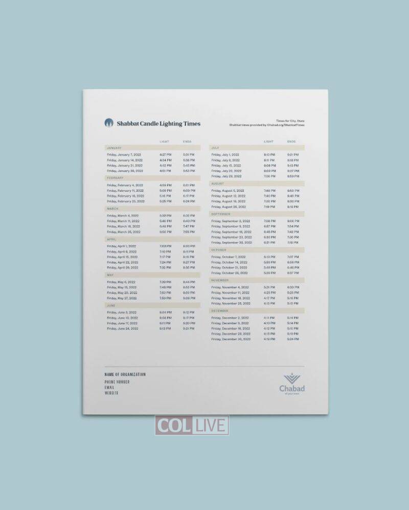 Whether a Shliach wants to upgrade his Shabbos packages, or infuse meaningful structure into a Friday night program or Shabbaton, the booklets are customizable for each Mosad, and include a personalized letter from the Shliach, the logo and a full year of Shabbos times for the location.