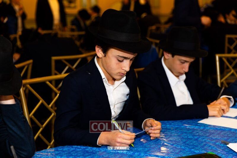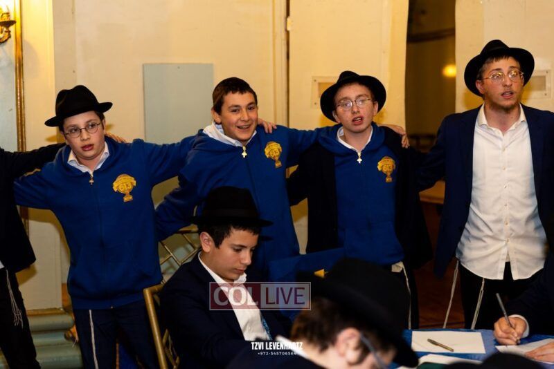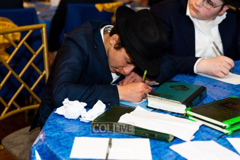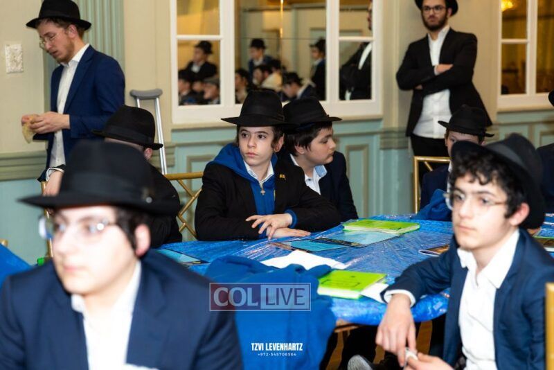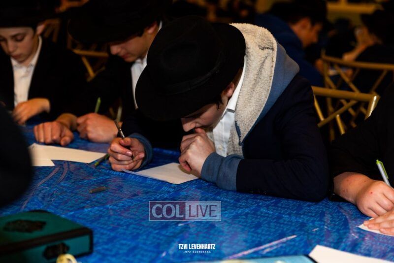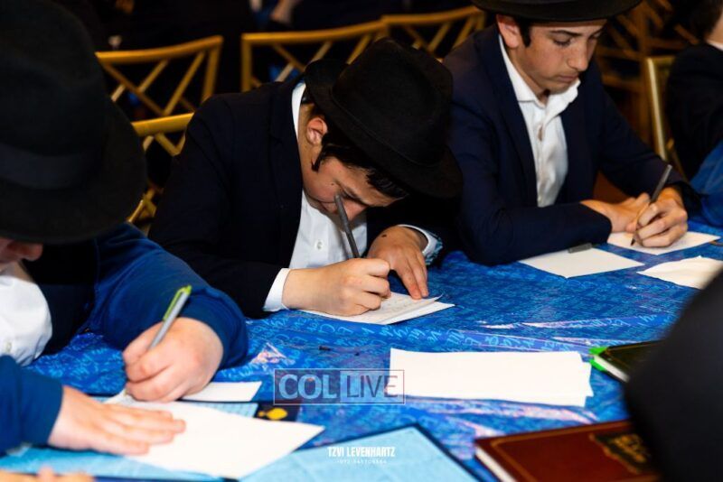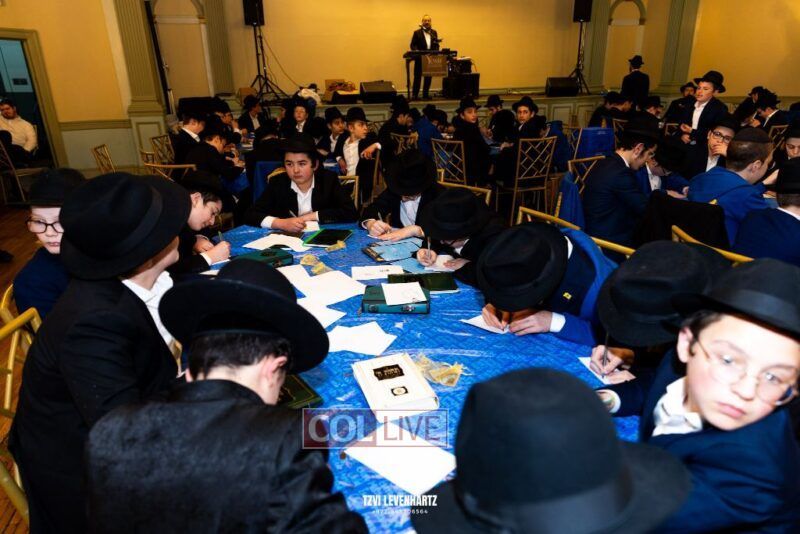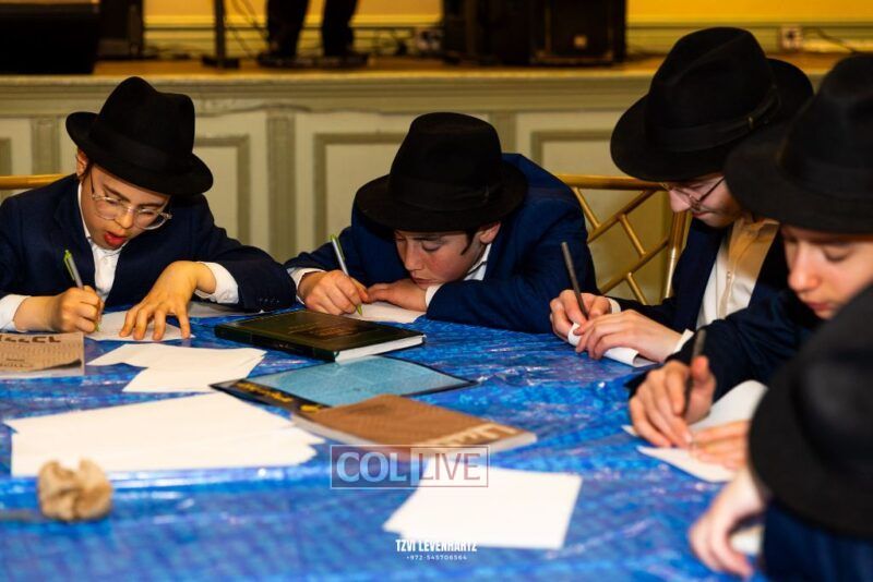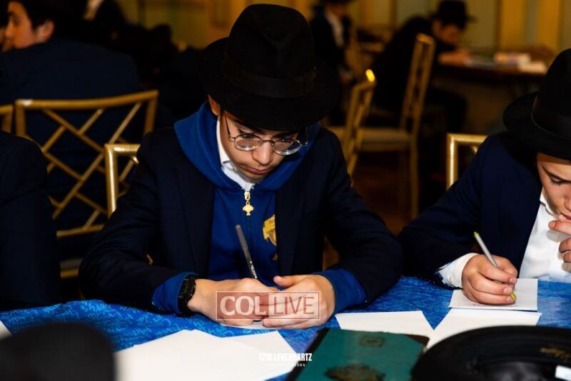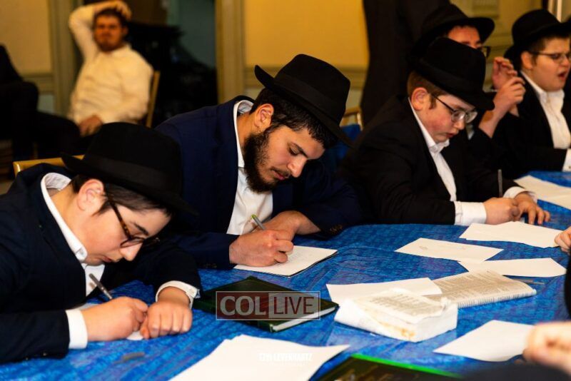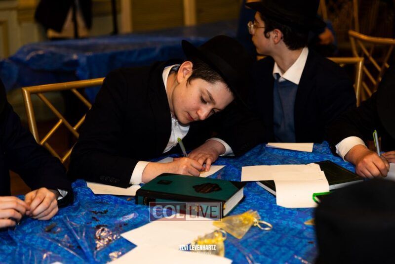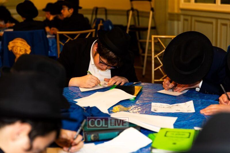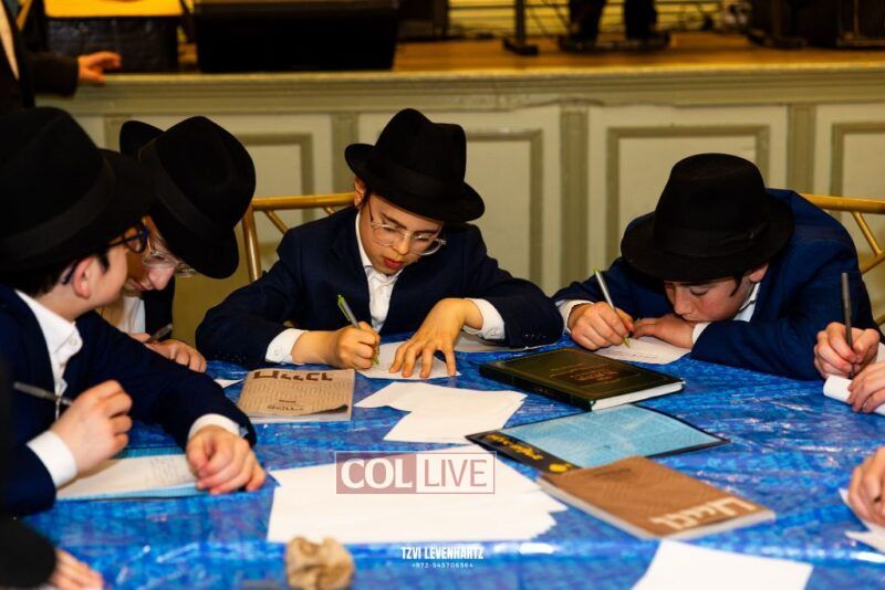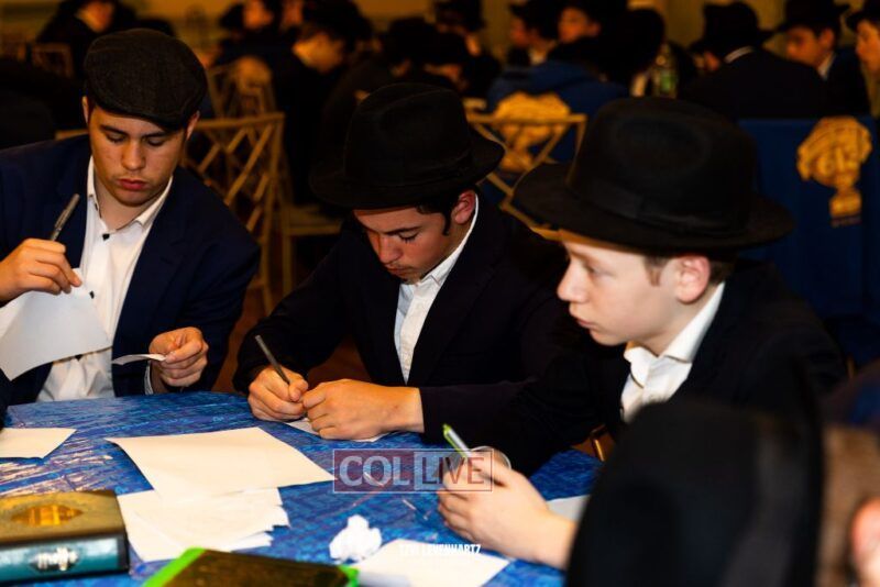 Boys in the International Chidon-Kol HaTorah Kulah program gathered on Motzei Shabbos to write Pan notes and for an upbeat Melava Malka. Photos