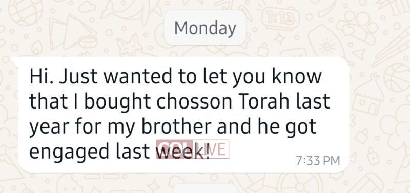 Someone else sent us a message that read, “I can’t believe I’m writing this…” She had bought Chosson Torah the previous year and was now preparing for her own engagement – scheduled for Chol HaMoed Sukkos, just a day before Shemini Atzeres and Simchas Torah.