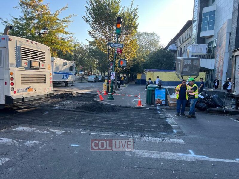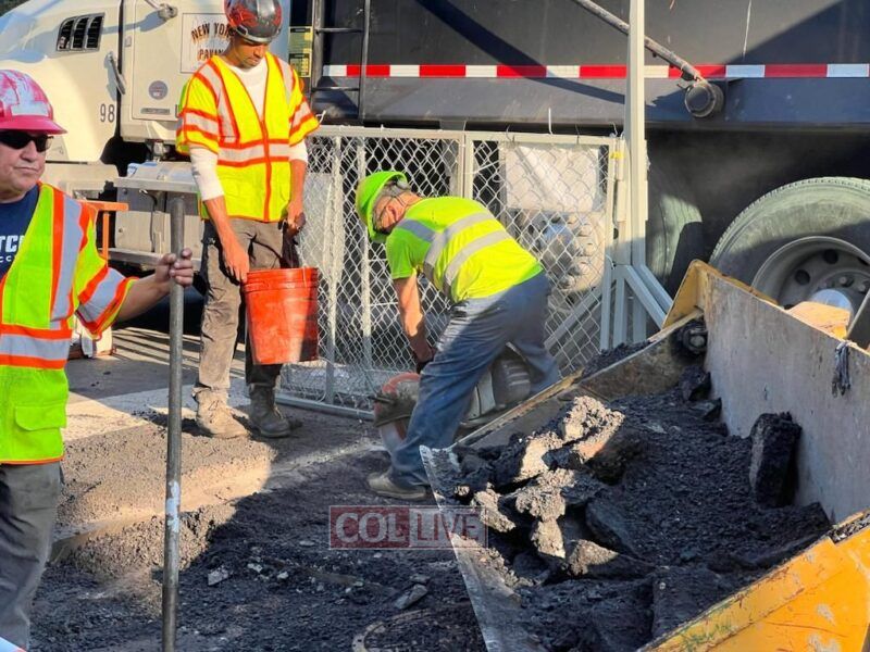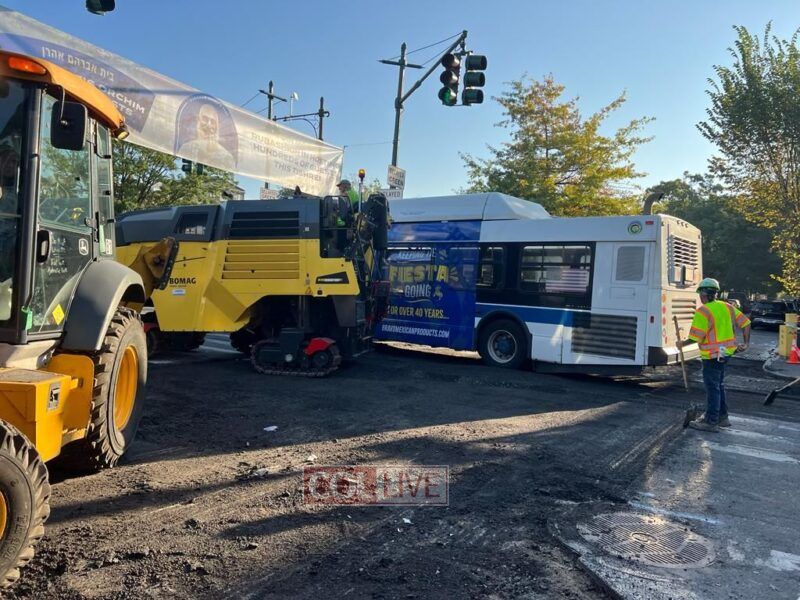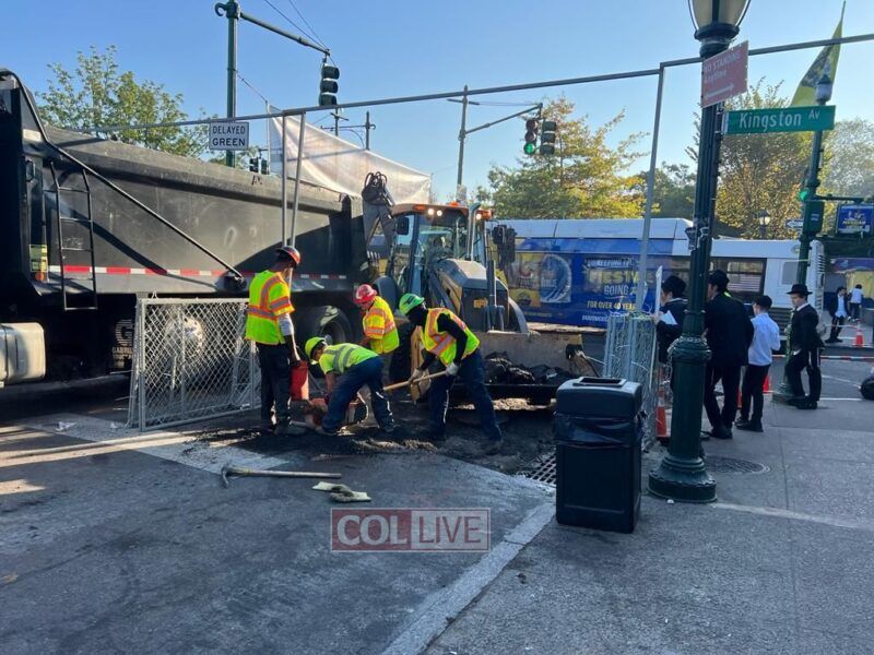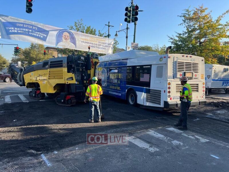 The repaving is being done on Kingston Avenue directly in front of 770 Eastern Parkway, the busiest intersection in Crown Heights, which is even more congested with vehicles and pedestrians during this week of Chol Hamoed Sukkos.