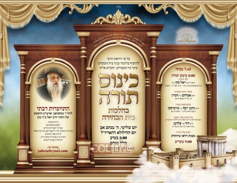 The Kinus Torah and Farbrengen will take place with the participation of Rabbonim, Mashpiim, members of the Hanhola of the Yeshiva and students of R’ Yoel, and will be held on the subject of Hilchos Beis Habechira, as per the directives of the Rebbe to learn about the Bais Hamikdash during the 9 Days.