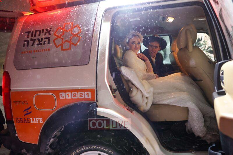 The guests escorted the couple as they walked out to the United Hatzalah vehicle with singing and dancing. The couple got into the car and were brought safely to their home in Bayit VaGan to conclude the most momentous day of their lives thus far.