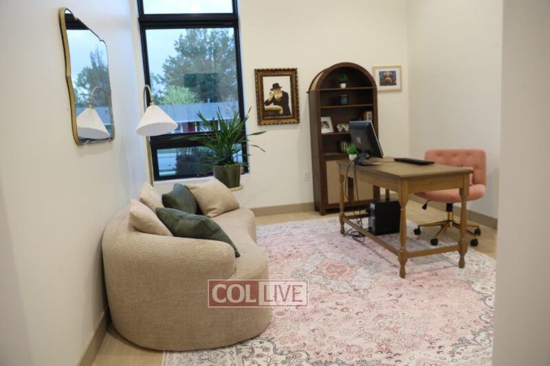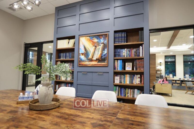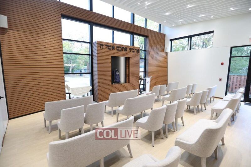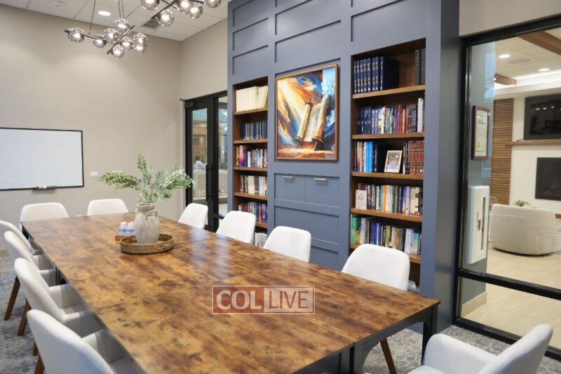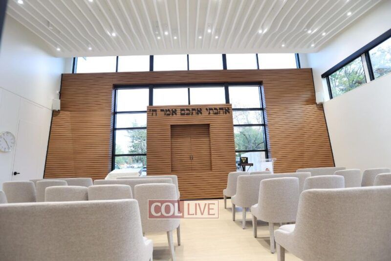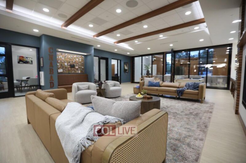 Inside, every space was designed with meaning and functionality. The main student lounge includes a modern fireplace, a snack bar, and open seating for conversation and study. The soundproof Library provides a quiet space filled with Torah study and learning. The beautiful Shul Sanctuary a glass wall that offers visibility and comfort for those hesitant to step inside; its ark is engraved with the Hebrew words אהבתי אתכם אמר ה׳—“I have loved you, says G-d”—reflecting Chabad’s spirit of warmth, love, and joy in Judaism. The sanctuary ceiling slopes upward in a gentle wave design, creating a feeling of uplift and openness.