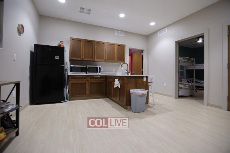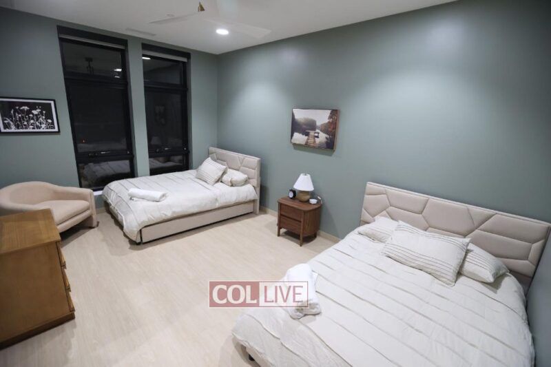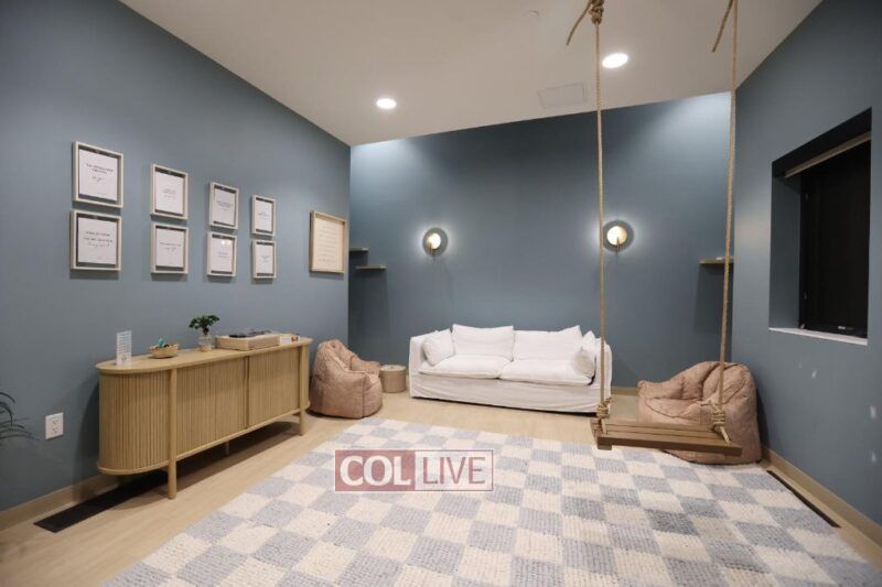 The dining hall has a home-like feel, and the adjoining commercial kitchen combines professional capability with residential comfort. On the second floor, the Neshama Lounge serves as a wellness and mental health space with indoor swings, a water feature, and positive messages on the walls. The building also includes 24 hospitality beds—known as the “Challaday Inn”—to welcome guests and students, completing a facility that is both inspiring and fully equipped to serve the KU Jewish community.