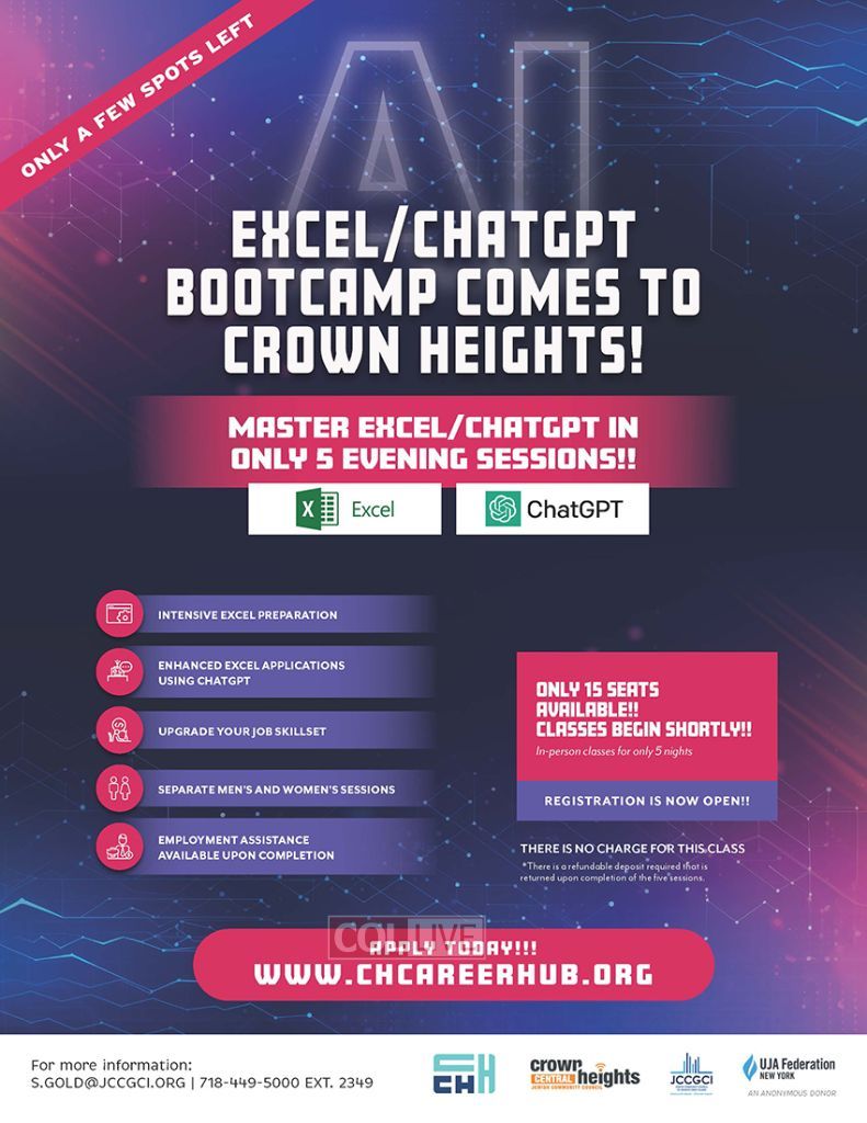 Due to popular demand, The Crown Heights Career Hub, an innovative employment training program, is now offering an intensive evening in-person EXCEL/CHATGPT 5-session training program geared specifically for the Chabad community. THE EXCEL/CHATGPT BOOTCAMP will give you the latest skillset needed to land a higher-paying job, or help you advance in your present position, by preparing you for higher-level employment.
