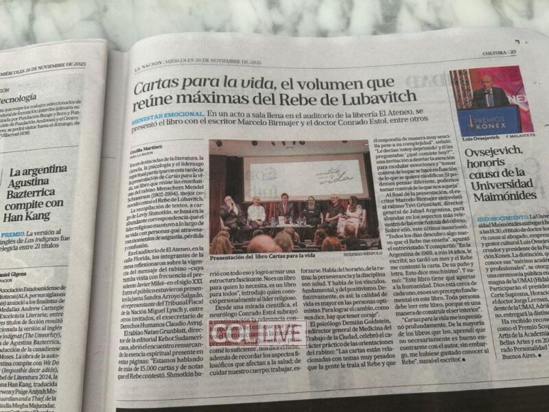 La Nación, one of Argentina’s most prominent newspapers, described Cartas para la Vida as “a work that offers tools for getting through difficult moments and for finding spiritual well-being,” noting that “prominent voices from literature, science, psychology, and spiritual leadership gathered for the presentation,” and that it “is based on the abundant correspondence the Rebbe maintained throughout his life with people who went through moments of anguish, loss, and confusion.”