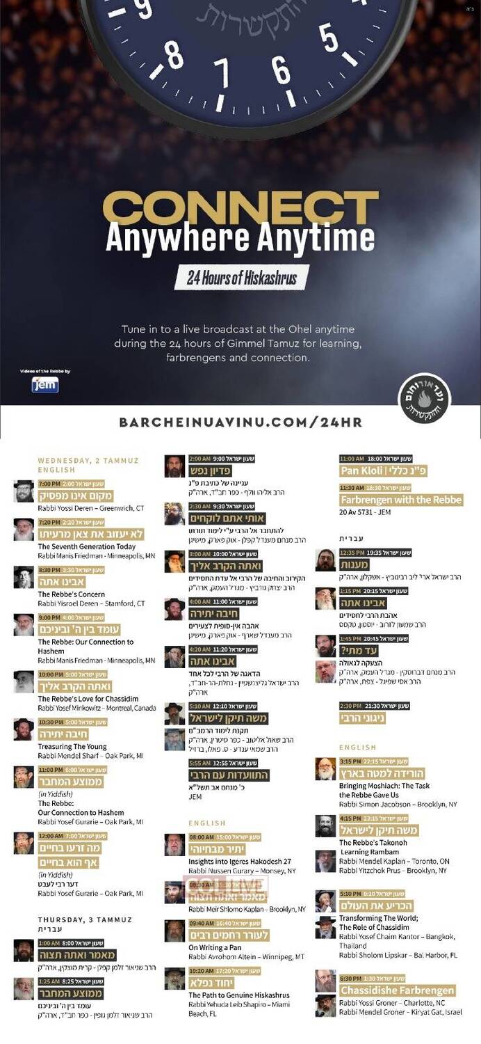 Tune in anytime during the day of Gimmel Tammuz, for a dose of chizuk, inspiration and learning.