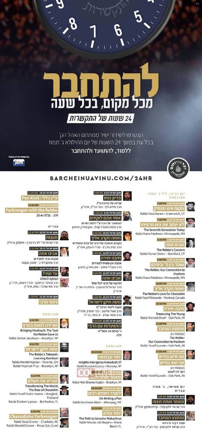 The 24 hours of learning will begin after the historic live online global gathering produced by Or VeChom, joining communities around the world together for an hour of achdus and inspiration.