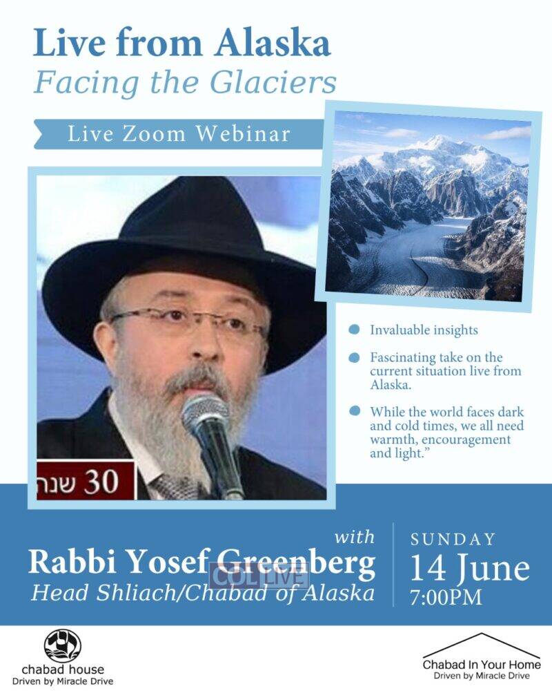 Facing the Glaciers: Live From Alaska, will take place online Sunday at 1:00 PM ET with Rabbi Yosef Greenberg, Head Shliach of Alaska.
