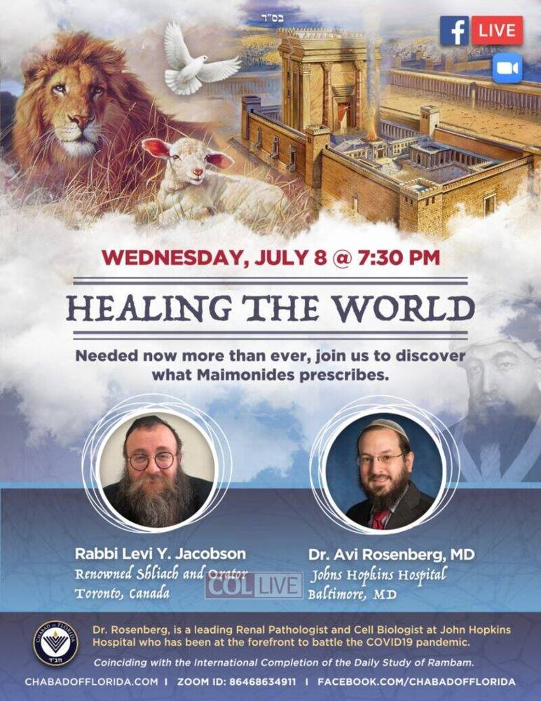 As the world seems to be reeling from the pandemic and daily chaos, healing is needed more than ever. Gleaned from the writings of Maimonides and culled from the teachings of the Rebbe, Rabbi Menachem M. Schneerson, Dr. Avi Rosenberg and Rabbi Levi Jacobson will share a Jewish perspective on how to face these difficult times and offer a fresh outlook on what our future holds.