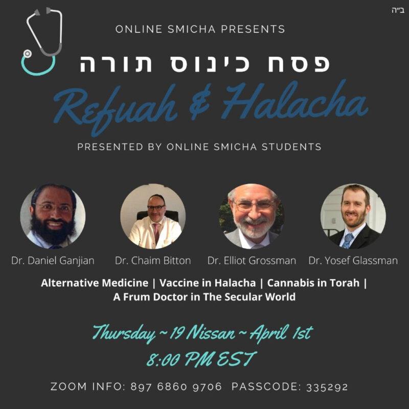 Topics will include Alternative Medicine and Halacha; Vaccines in Halacha; Cannabis in Torah; and A Frum Doctor in the Secular World.