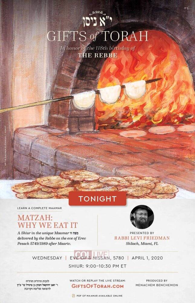 The Shiur, titled: MATZAH: WHY WE EAT IT, is a text-based study in the unique Maamar Matzah Zu, delivered by the Rebbe on the eve of Erev Pesach 5749/1989 after Maariv.