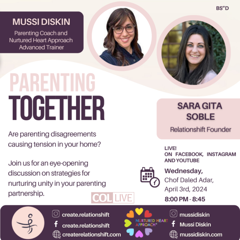 Enter Sara Gita Soble, the visionary founder of Relationshift, whose groundbreaking approach to marriage has brought Shalom Bayis to hundreds of women who have sought coaching, or attended her workshops. Relationshift is now presenting an empowering perspective on parenting as a team. Sara Gita recognizes the profound importance of unity in parenting, not only for the well-being of the children, but also for the harmony of the couple, and thus the entire family.