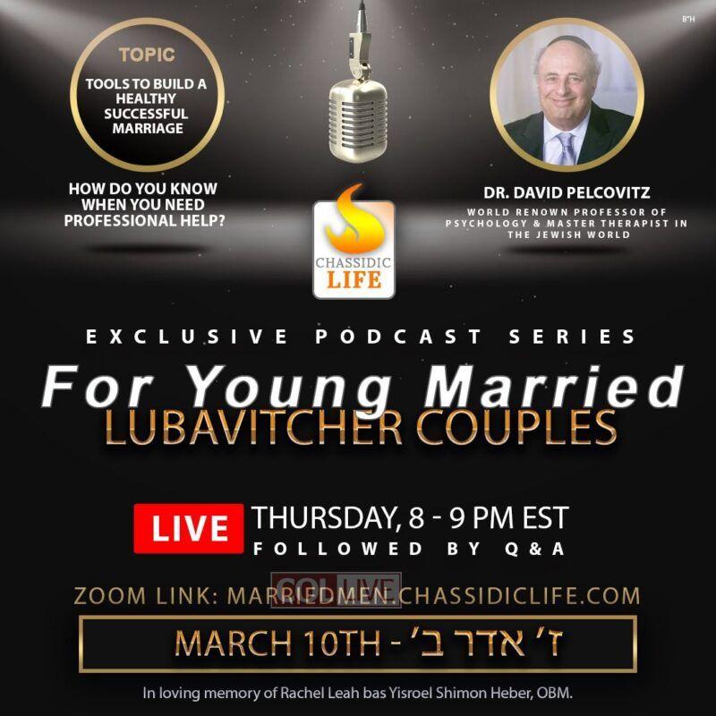 A podcast for young married couples will take place tonight with Dr. David Pelcovitz: “Tools to help build healthy, successful marriages.”
