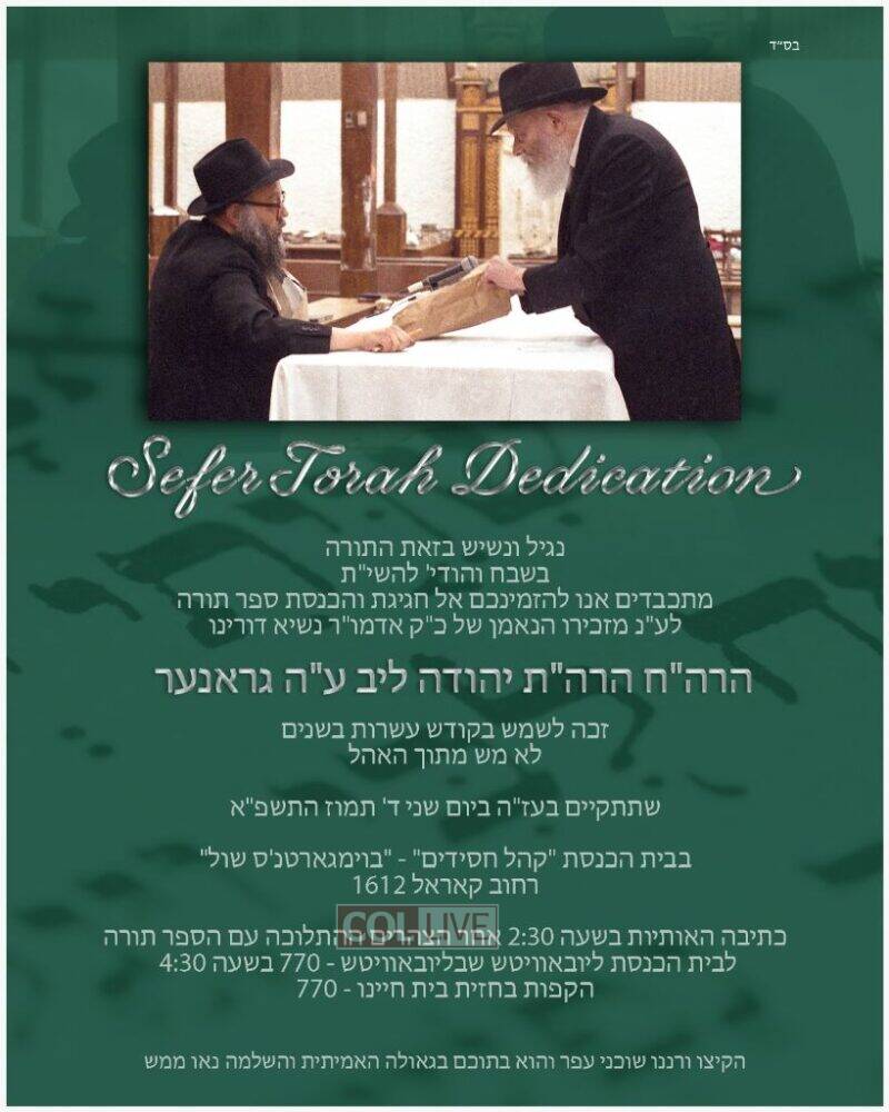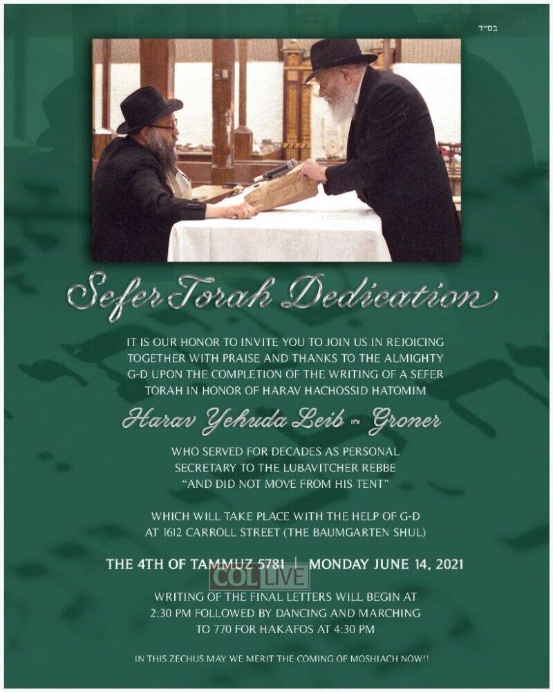 A new Sefer Torah will be dedicated in memory of Rabbi Yehuda Leib Groner obm, who served for decades as personal secretary to the Rebbe.