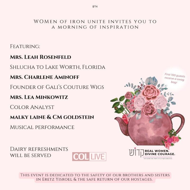 • Mrs. Leah Rosenfeld, Shlucha to Lake Worth, FL, who will talk about the incredible growth she experiences through the women and girls in her community.