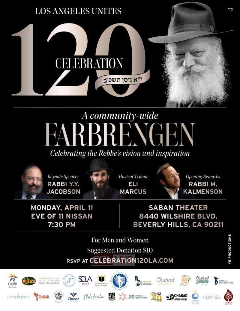 Join Live Now: An event uniting hundreds in Los Angeles will take place to mark the Rebbe's 120th birthday on Yud Alef Nissan, with speakers Rabbi YY Jacobson, Rabbi Mendel Kalmenson, and music by singer Eli Marcus. Live