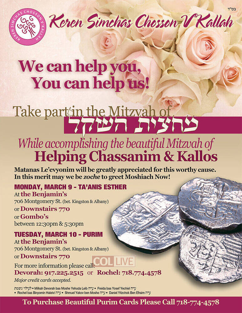 Take part in the Mitzvah of Machatzis Hashekel while supporting KSCVK, supporting needy Chassanim and Kallahs in our community.