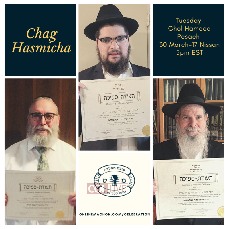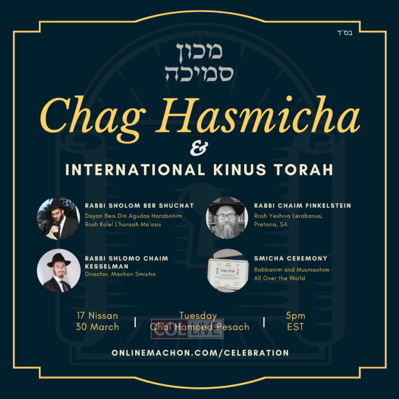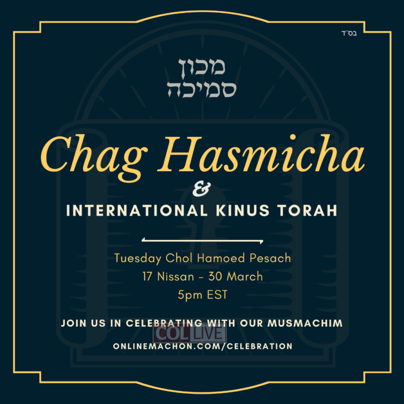 The event will take place on Tuesday, Chol Hamoed Pesach, 17 Nissan (30 March) at 5pm EST. To join the Chag Hasmicha, go to onlinemachon.com/celebration.