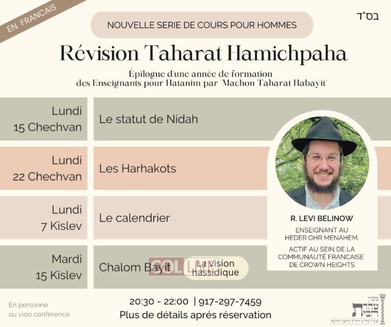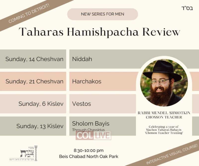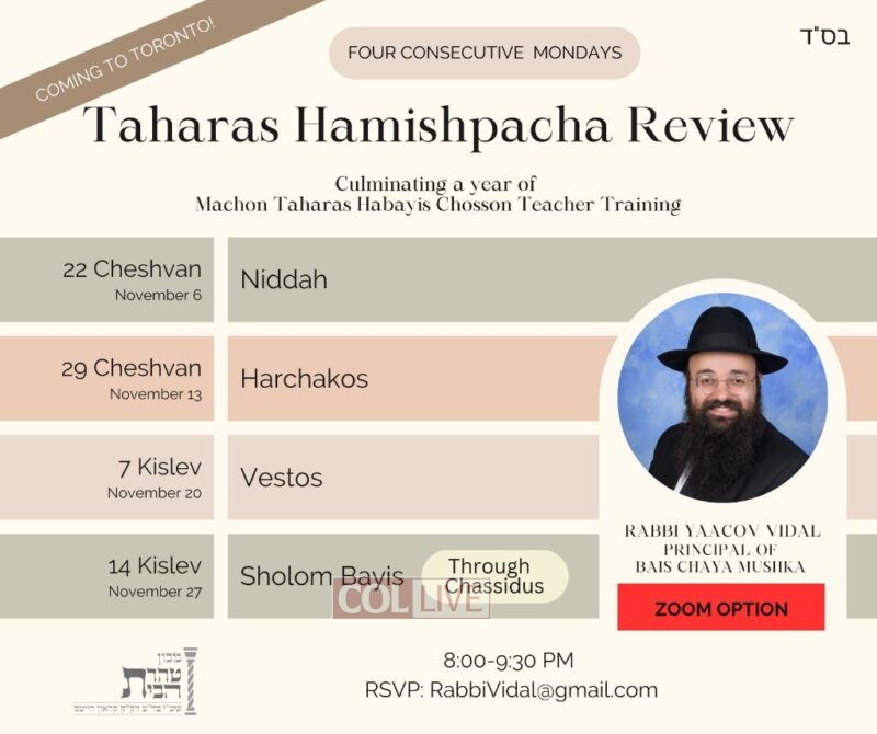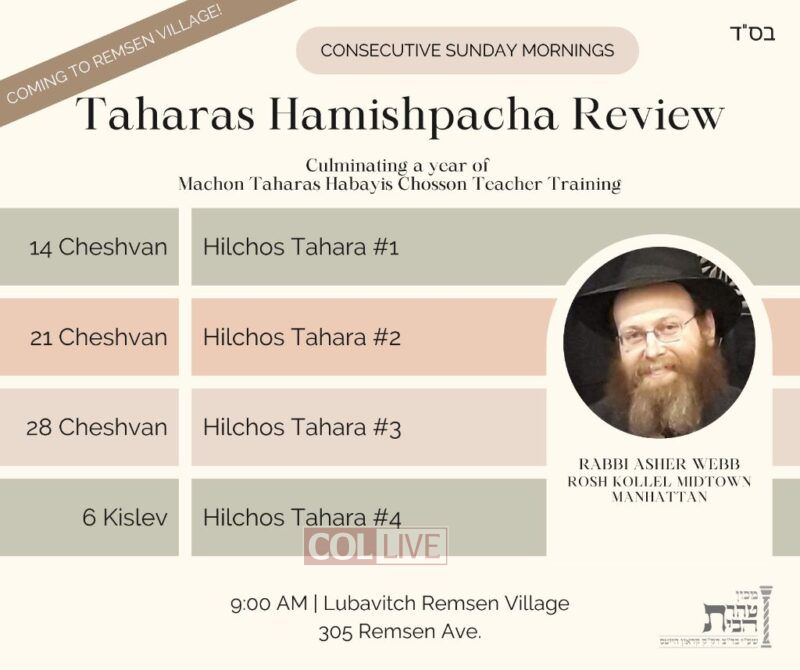 Machon Taharas Habayis is now launching Taharas Hamishpocha review series in various communities around the globe at different times to help the masses refresh these very special Halochos.