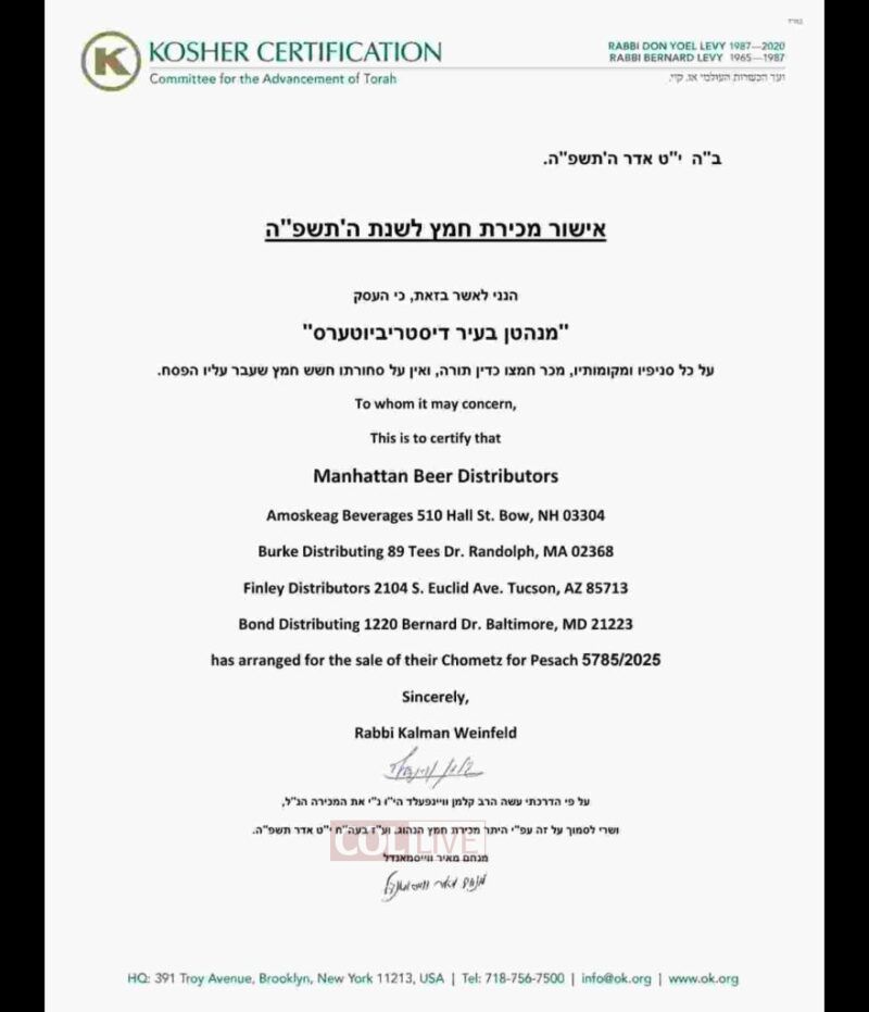 Manhattan Beer sold its chometz for the first time in 2018 after Rabbi Don Yoel Levy OBM, the late head of OK Kosher and Rov of Bais Eliezer Yitzchok in Crown Heights, urged Jewish consumers to avoid purchasing brands they distributed for a period after Pesach.