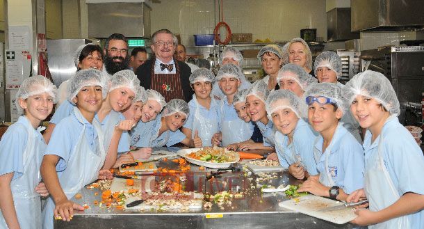 The super chef donned his Our Big Kitchen Apron and headed for the pots and pans on the stoves in the commercial kitchen ready to give the children a few tips to improve their cooking skills.