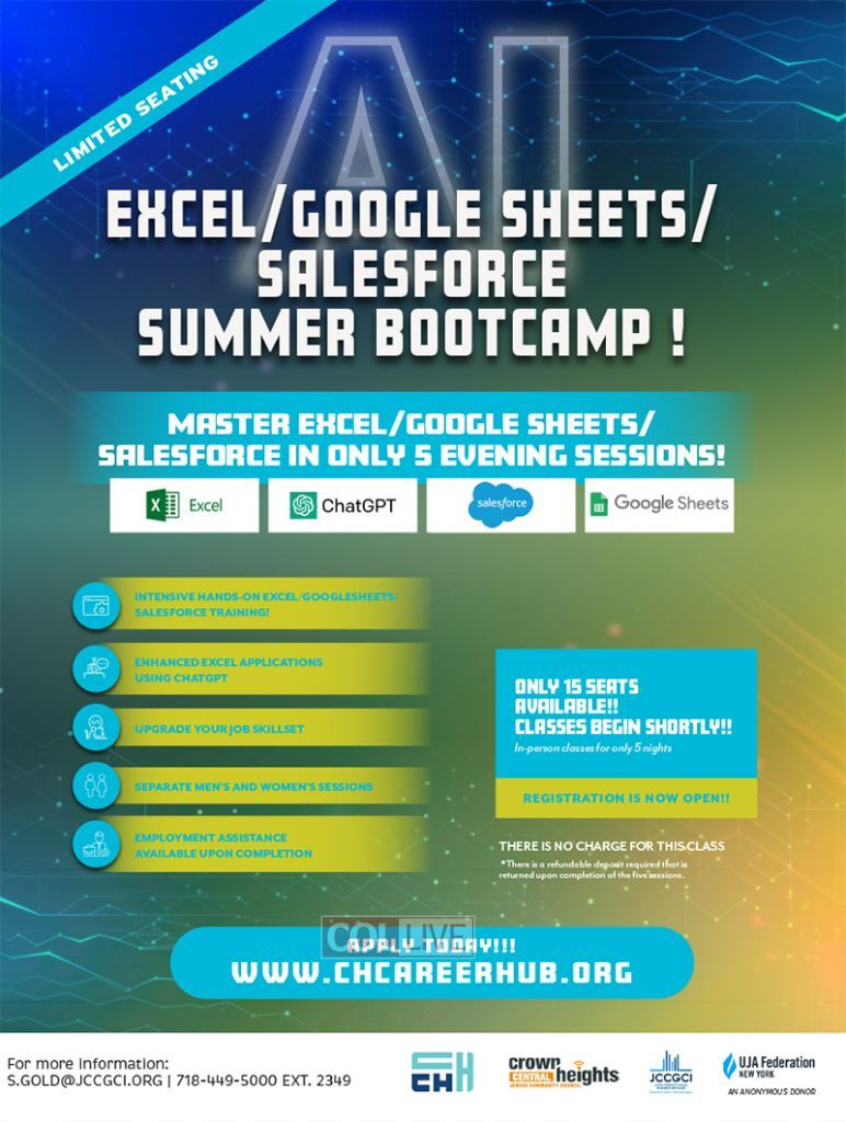 Due to popular demand, The Crown Heights Career Hub, an innovative employment training program, is now offering intensive evening in-person summer EXCEL/GOOGLESHEETS/SALESFORCE 5-session evening BOOTCAMP, geared specifically for the Crown Heights Chabad community. You will master the latest skillsets needed to land a higher-paying job, or help you advance in your present position by preparing you for higher-level employment.