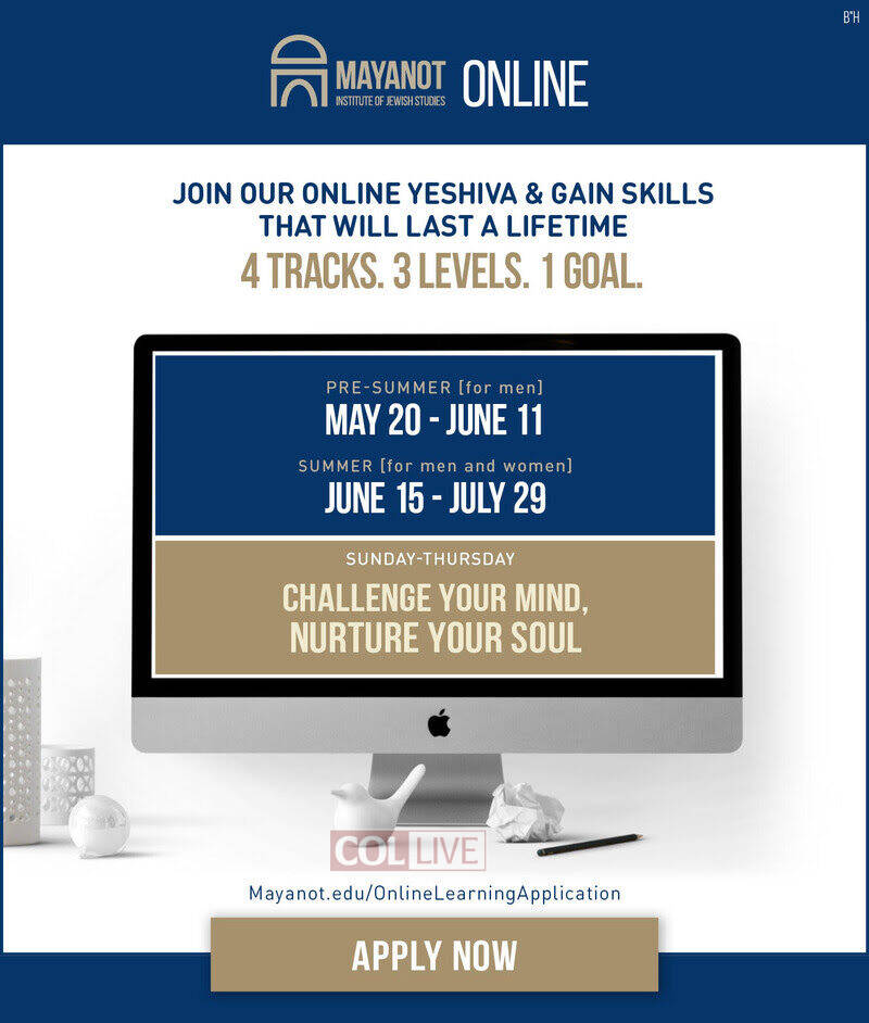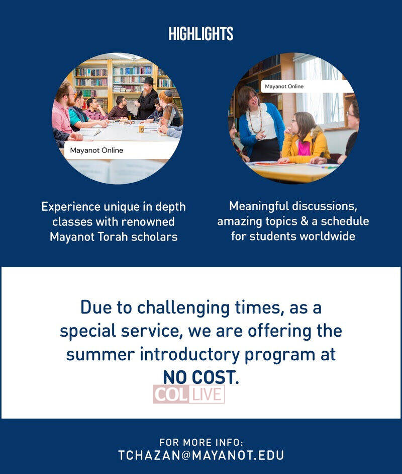 This online opportunity is being offered by Mayanot at no charge for the summer session. It is an amazing chance to invite anyone that is interested in seeing what in-depth Torah learning is about. Start dates begin May 20th and June 15th. For those interested, register by clicking here.