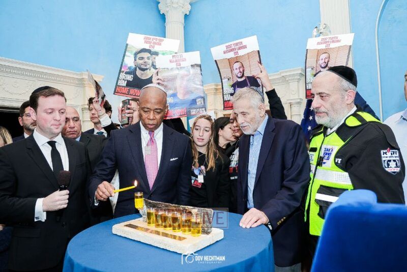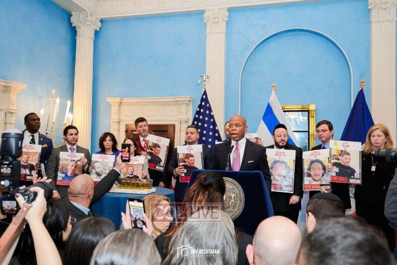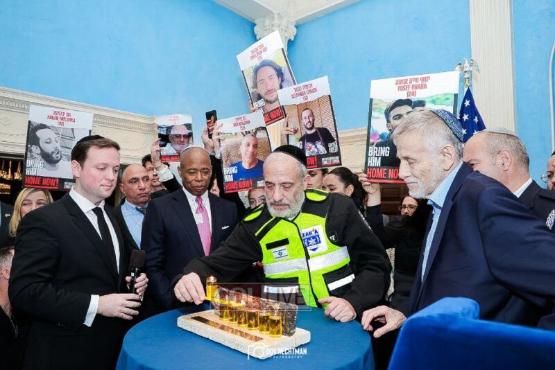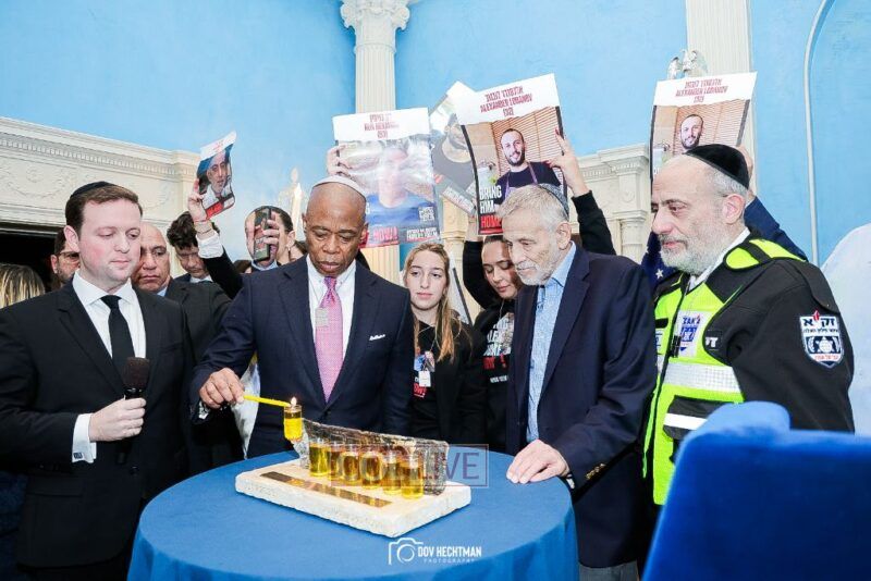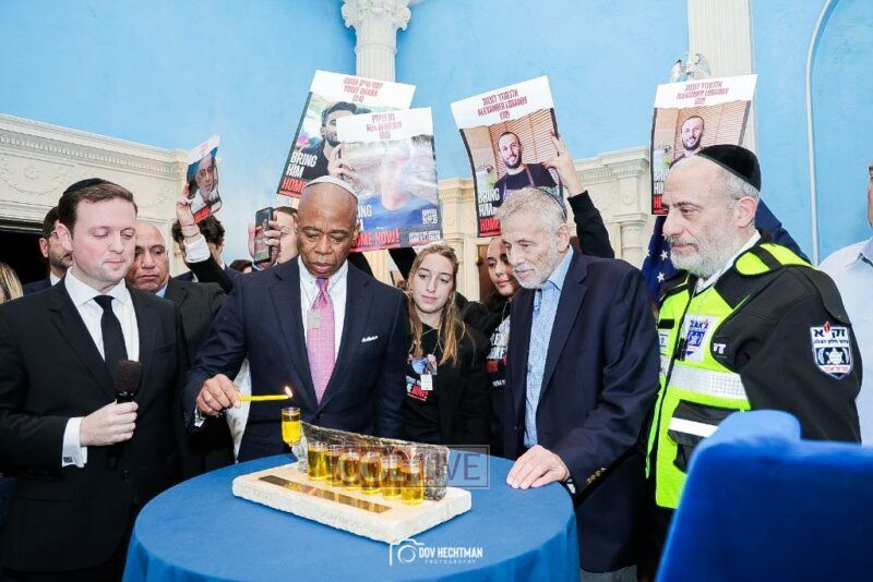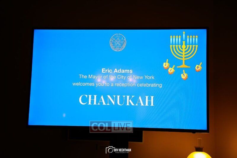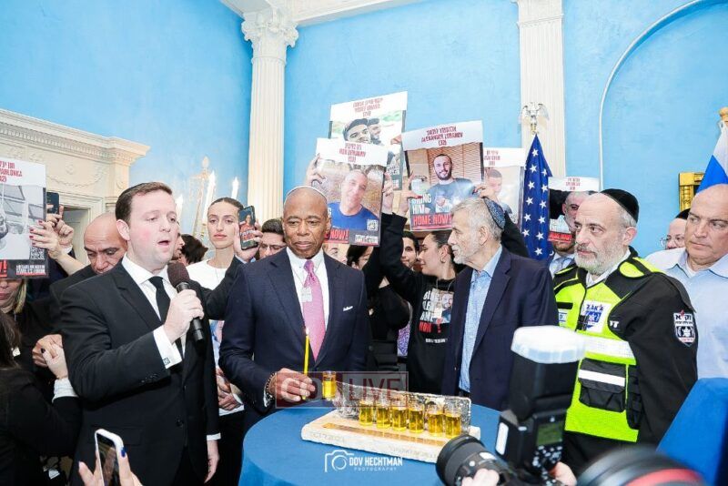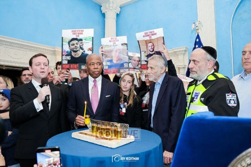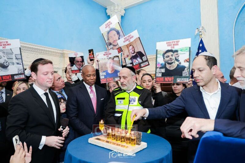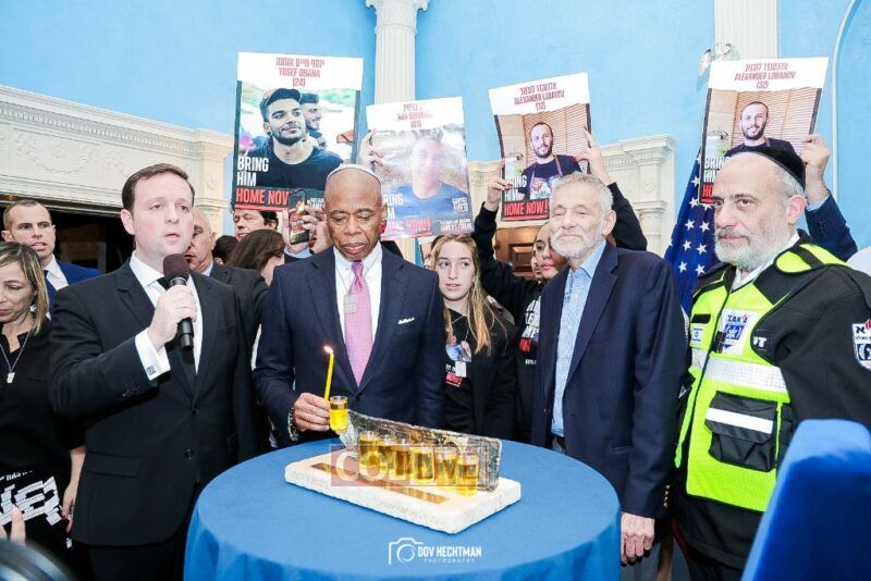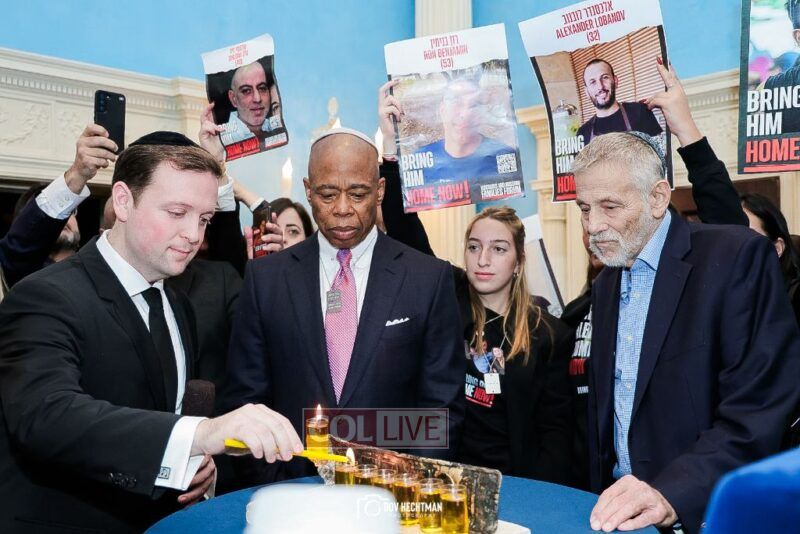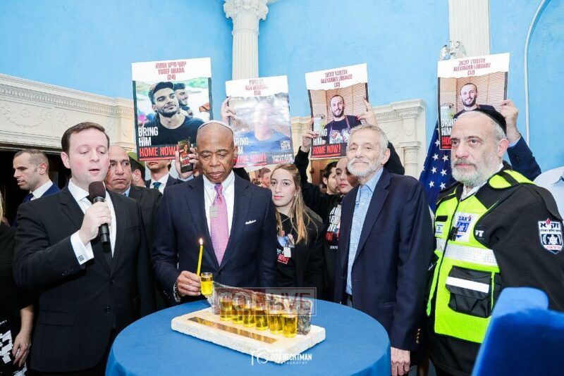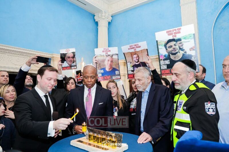 New York City Mayor Eric Adams hosted hundreds of community leaders for a Chanukah gathering at Gracie Mansion Tuesday night where he decried the rise of antisemitism and presented the families of Israeli hostages held by the Hamas terrorists and issued a demand for their release.