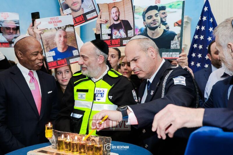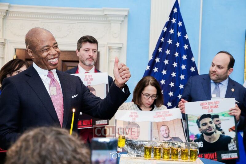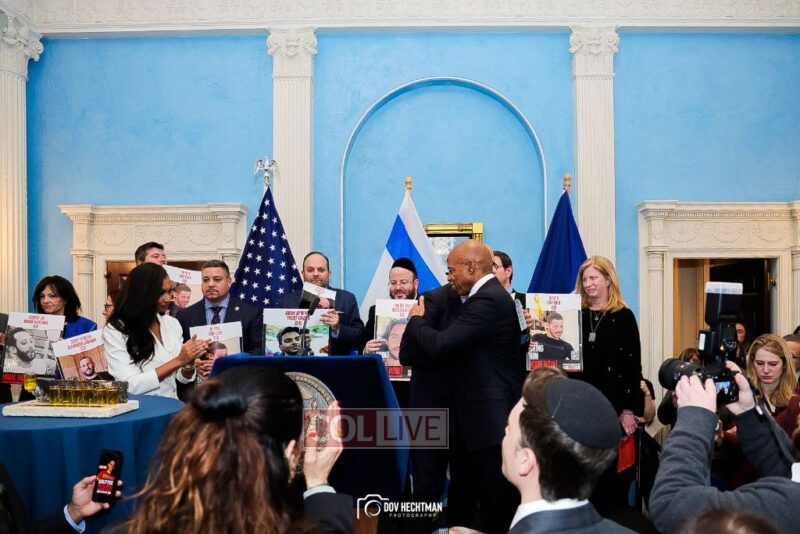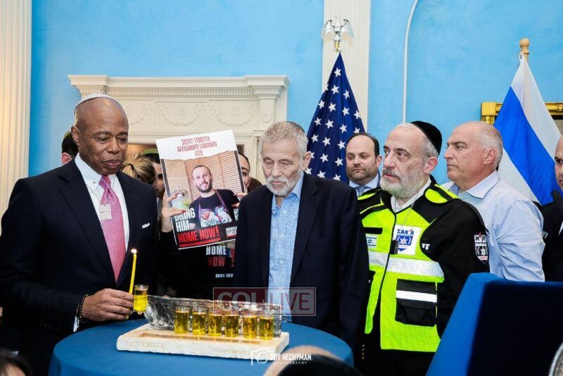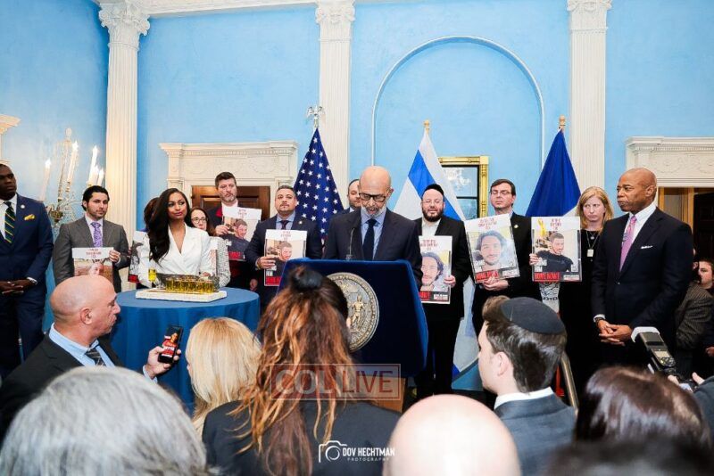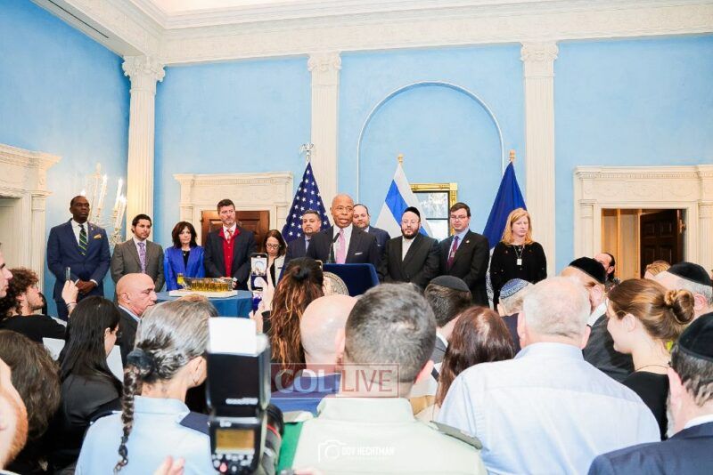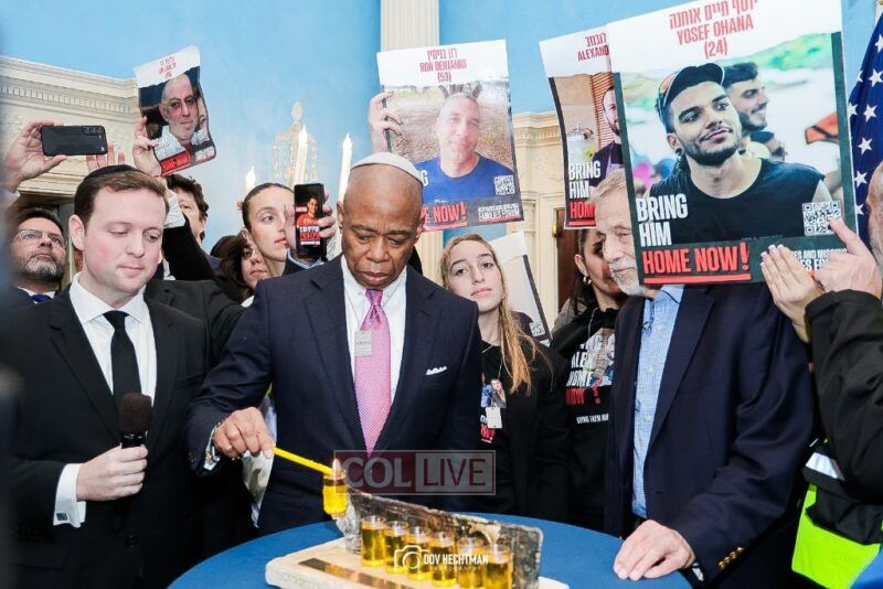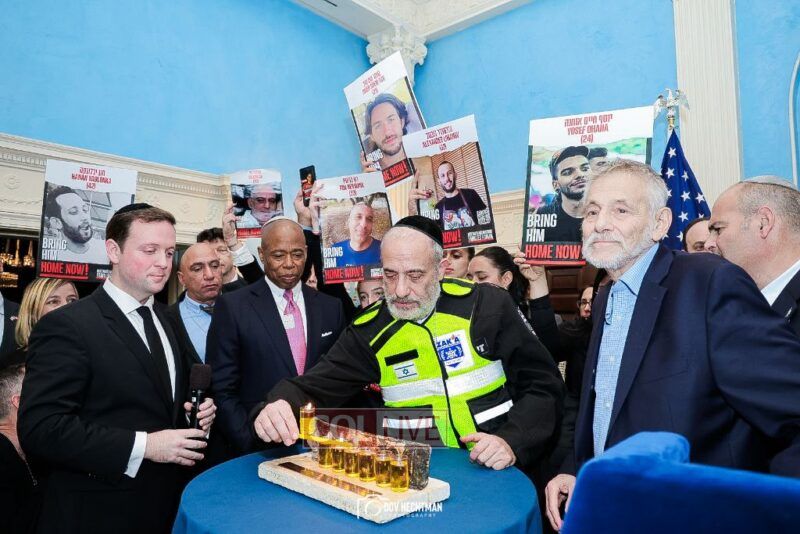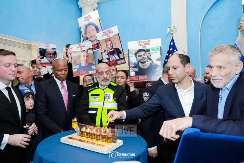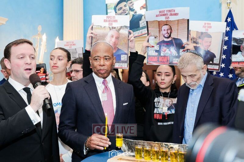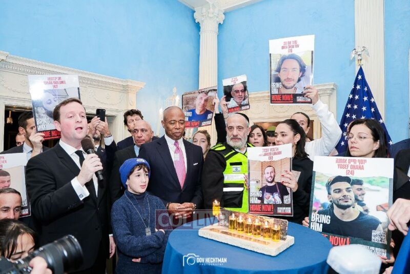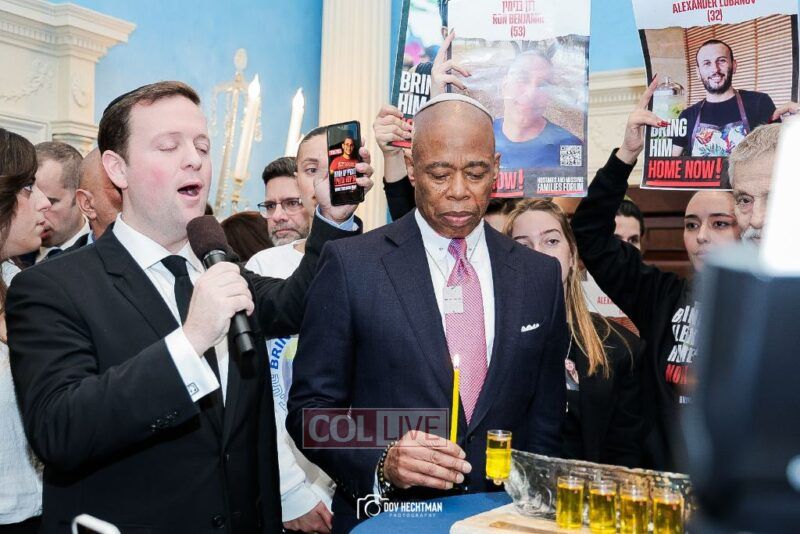 New York City Mayor Eric Adams hosted hundreds of community leaders for a Chanukah gathering at Gracie Mansion Tuesday night where he decried the rise of antisemitism and presented the families of Israeli hostages held by the Hamas terrorists and issued a demand for their release.