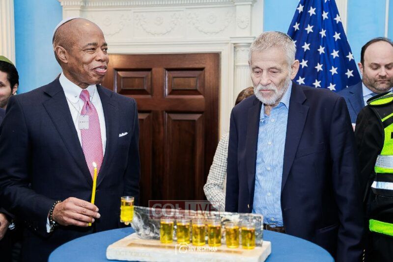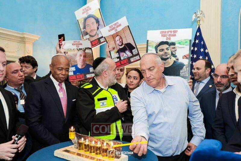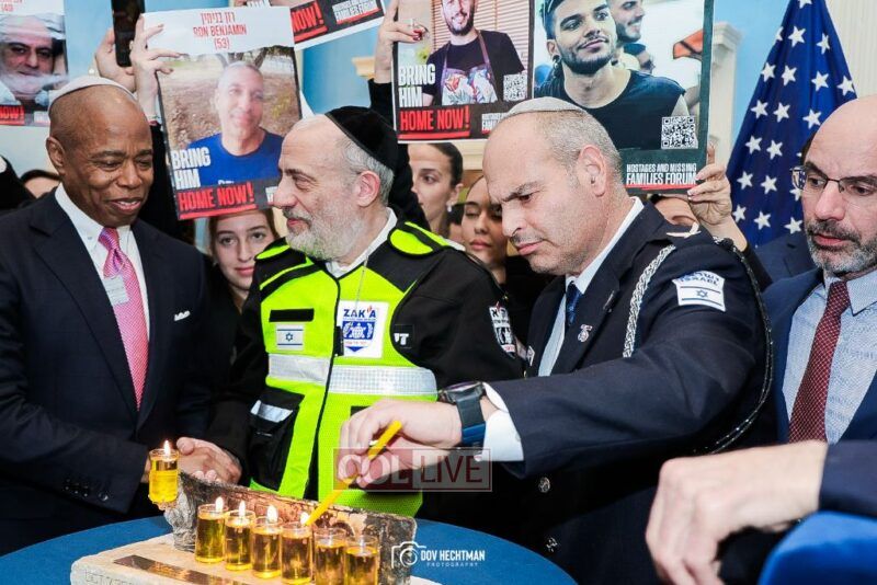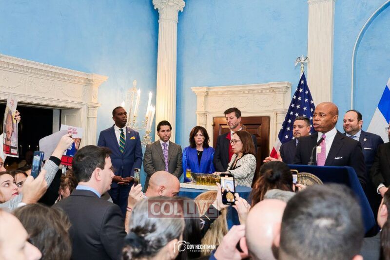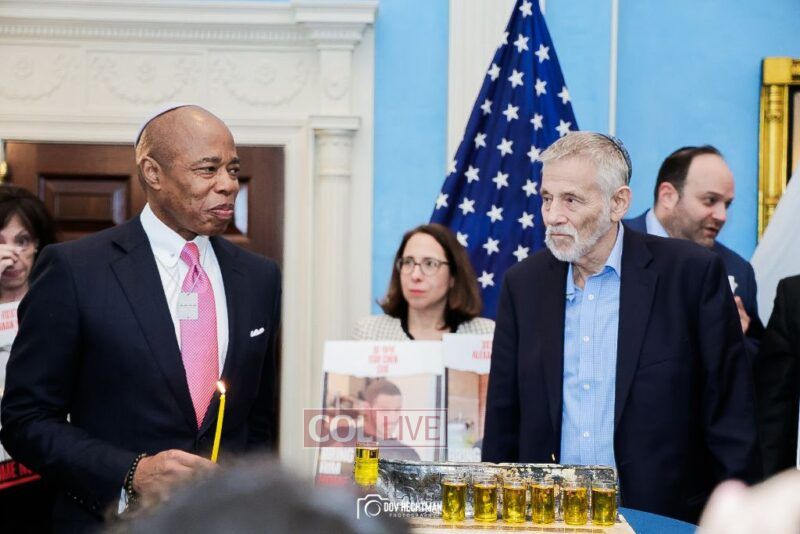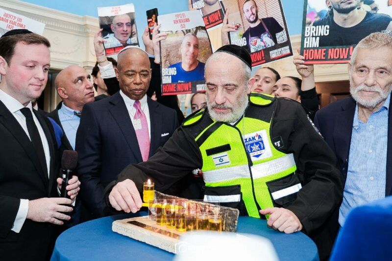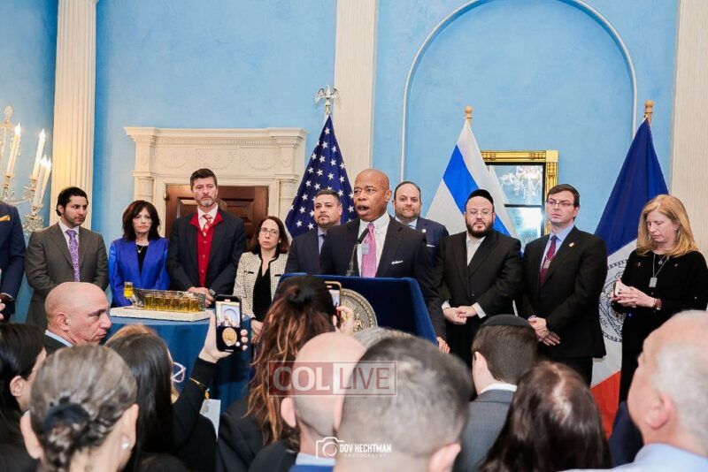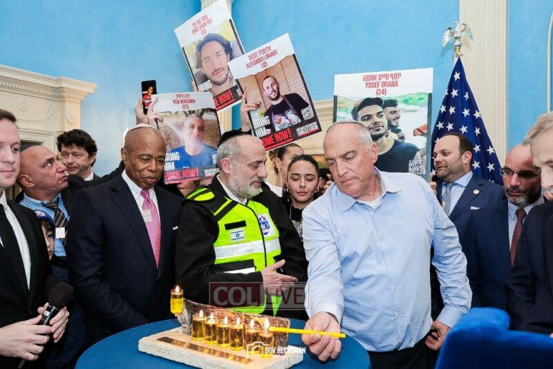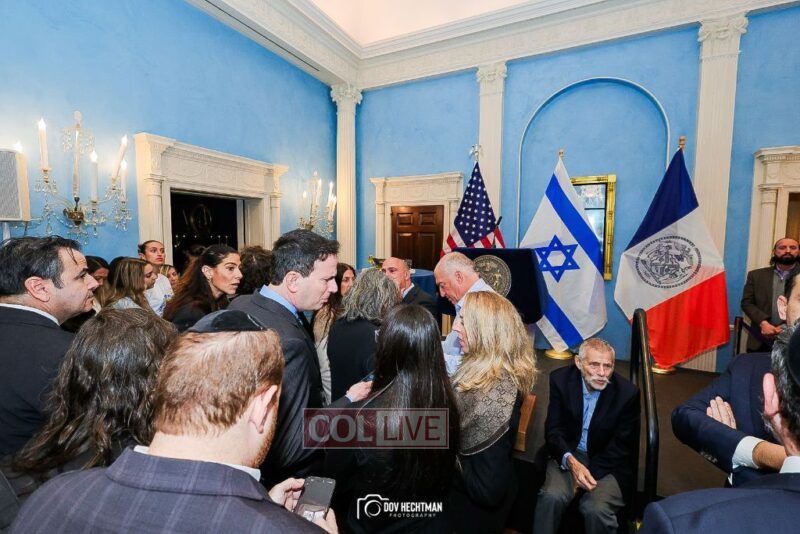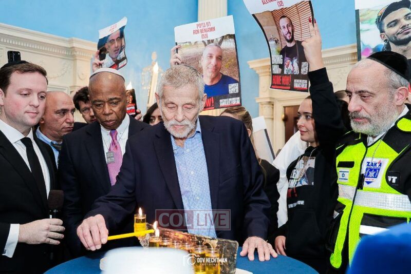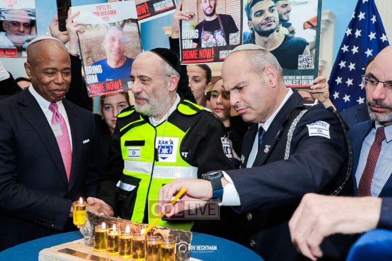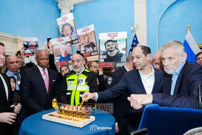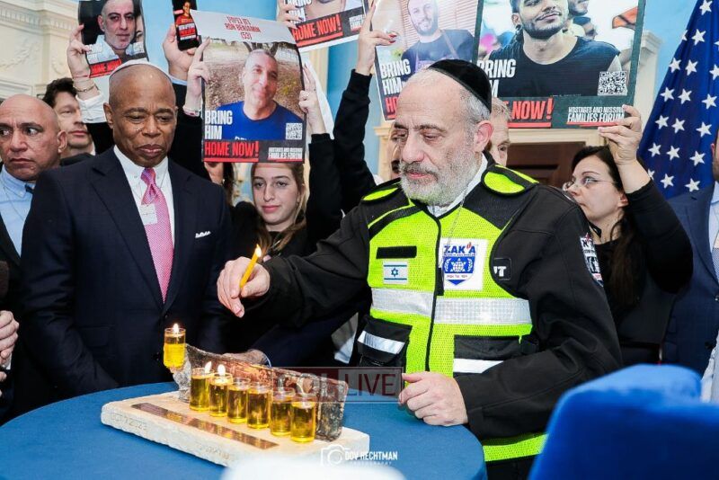 New York City Mayor Eric Adams hosted hundreds of community leaders for a Chanukah gathering at Gracie Mansion Tuesday night where he decried the rise of antisemitism and presented the families of Israeli hostages held by the Hamas terrorists and issued a demand for their release.