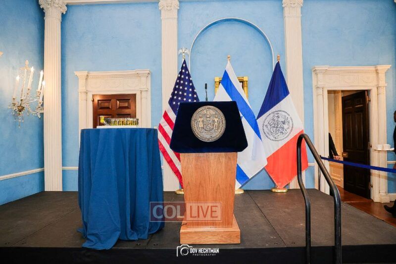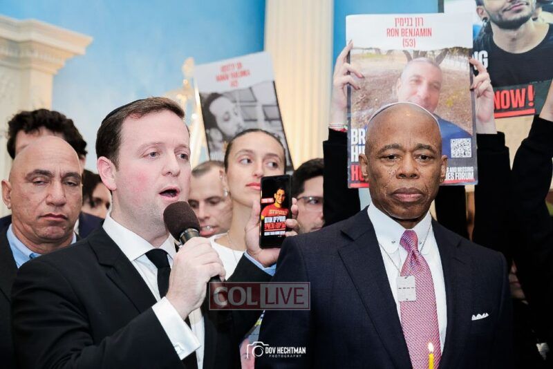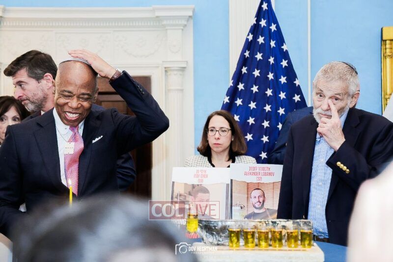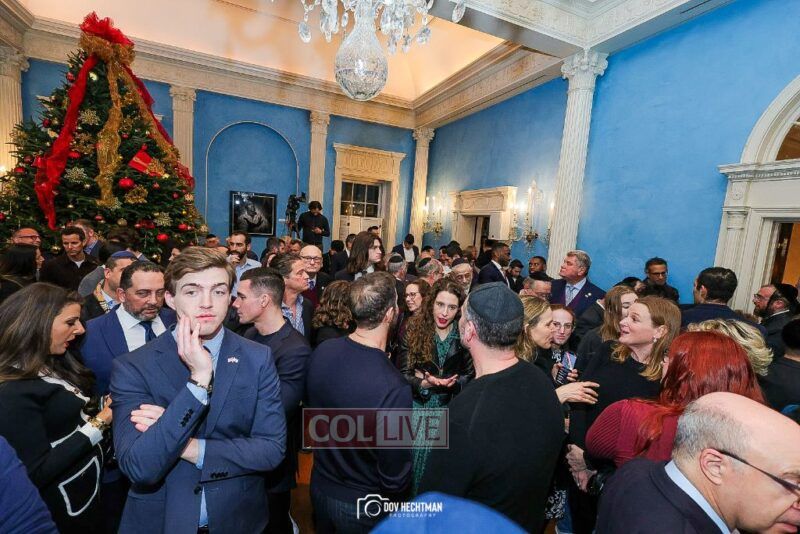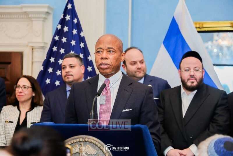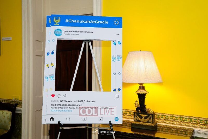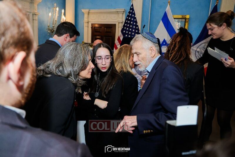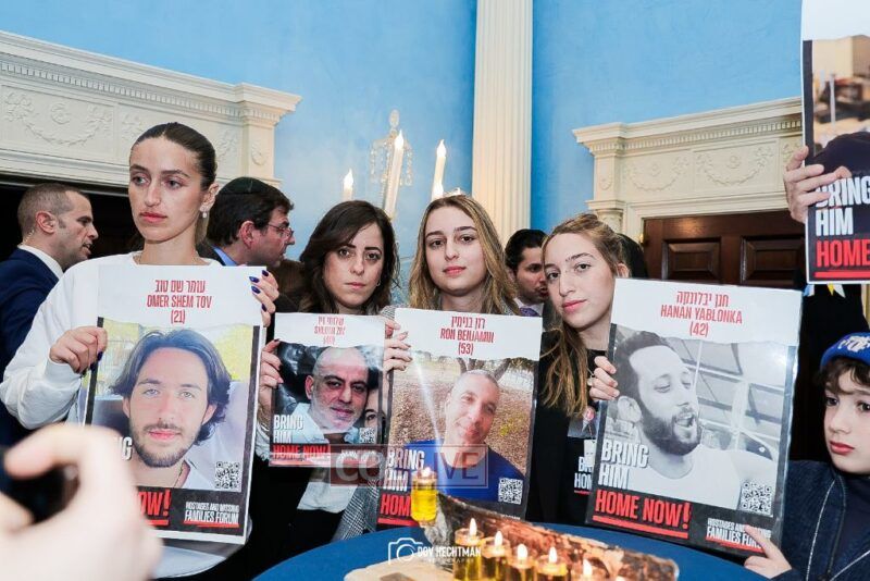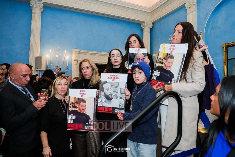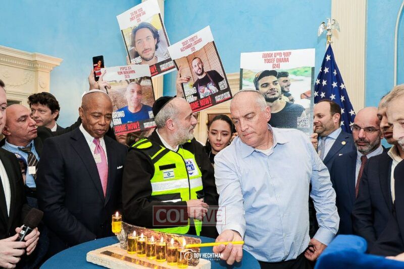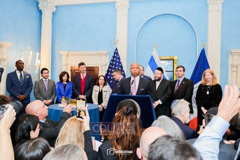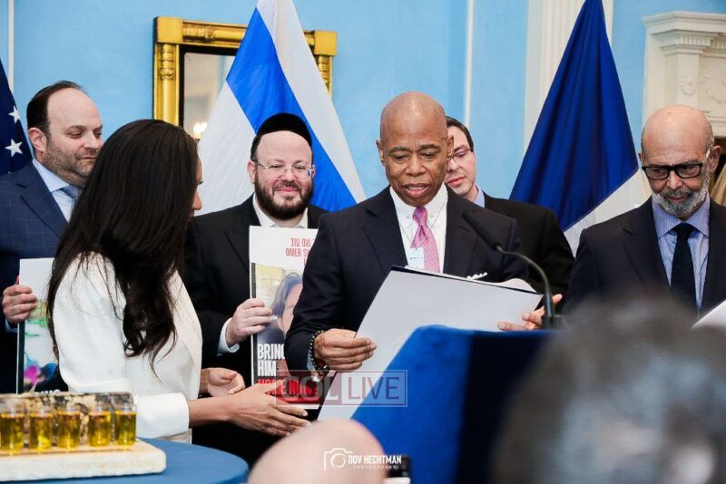 New York City Mayor Eric Adams hosted hundreds of community leaders for a Chanukah gathering at Gracie Mansion Tuesday night where he decried the rise of antisemitism and presented the families of Israeli hostages held by the Hamas terrorists and issued a demand for their release.