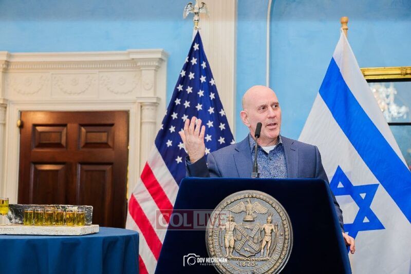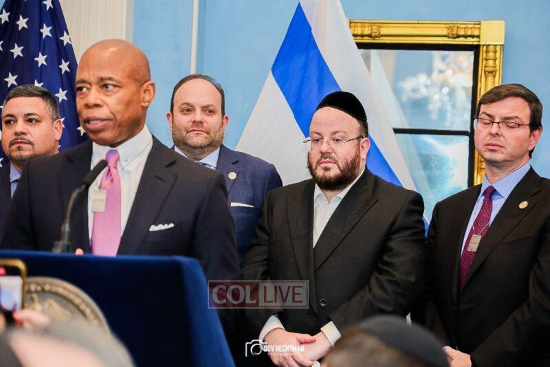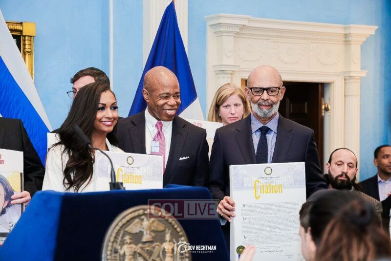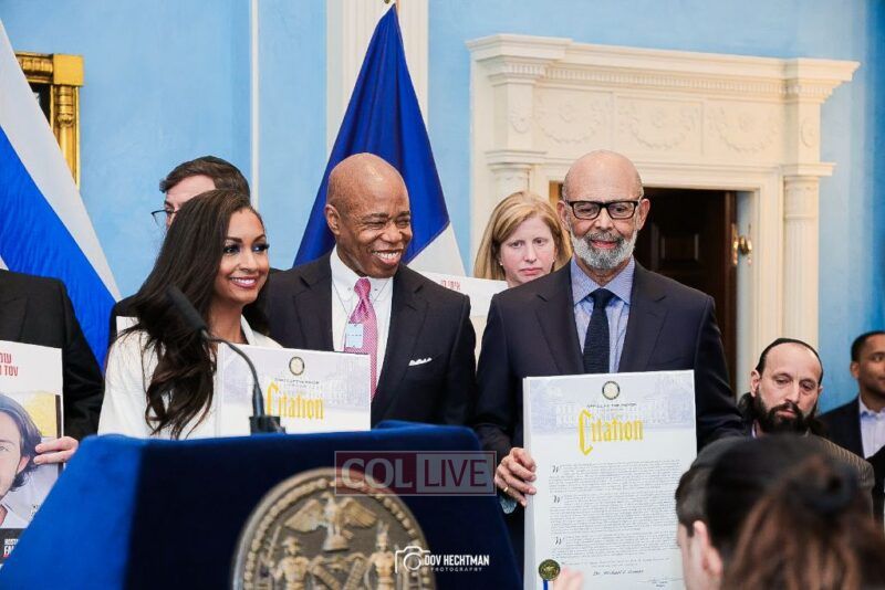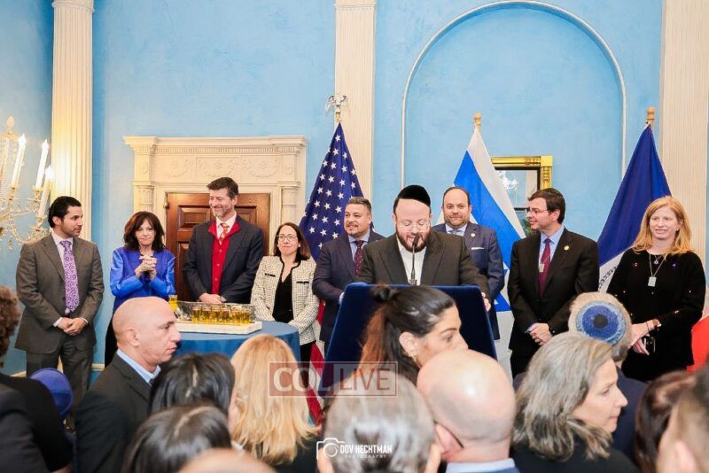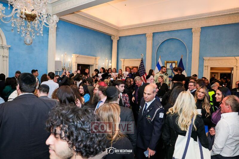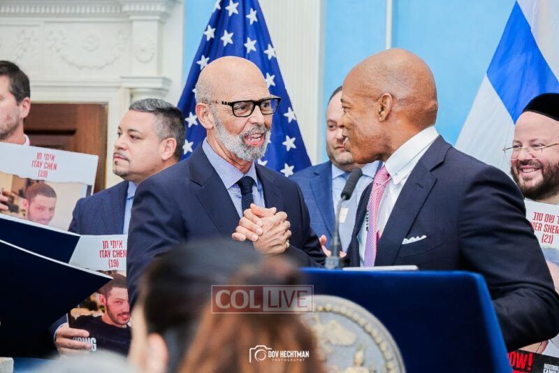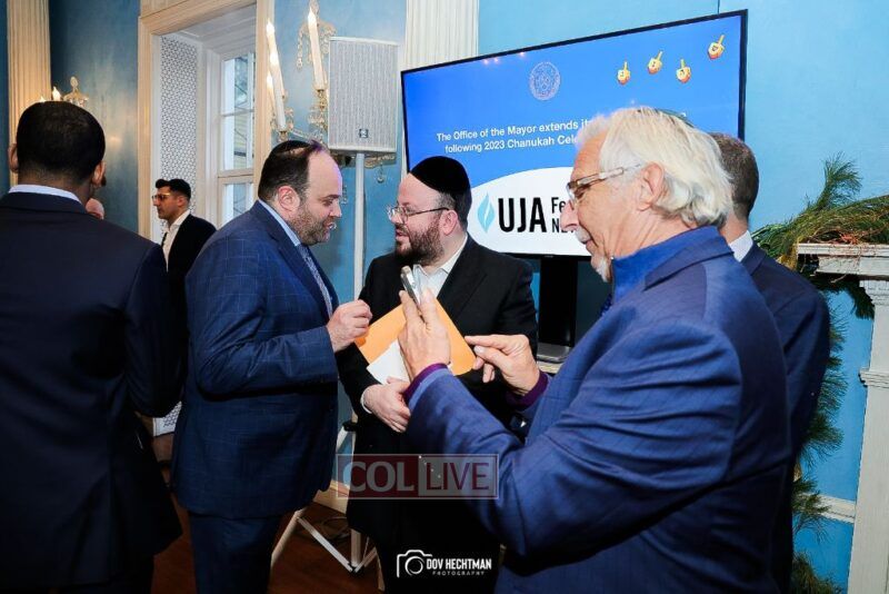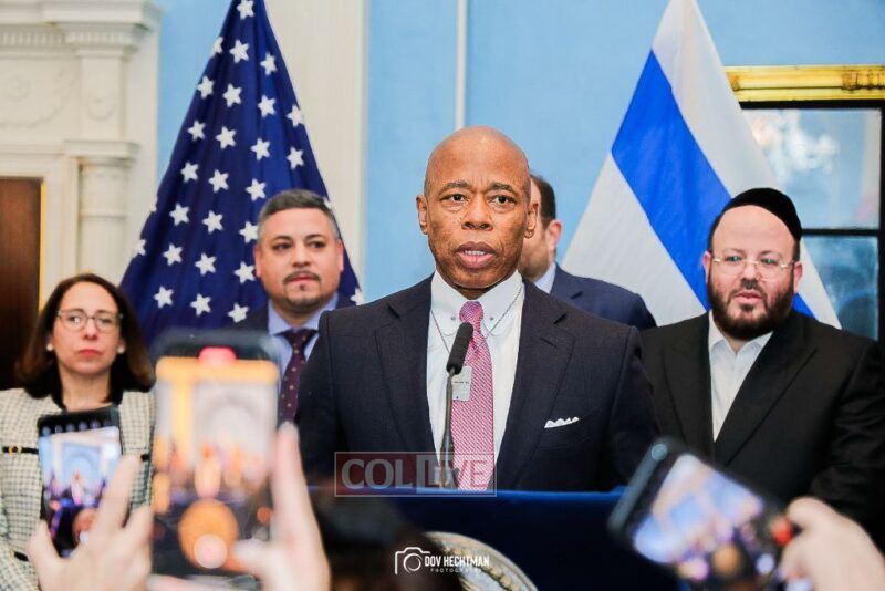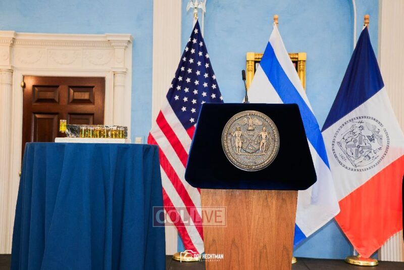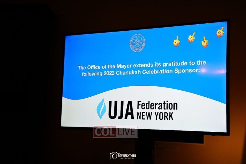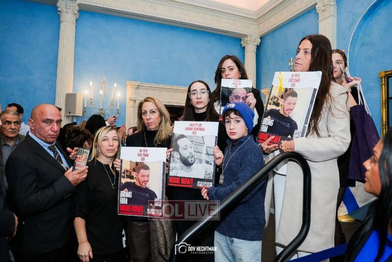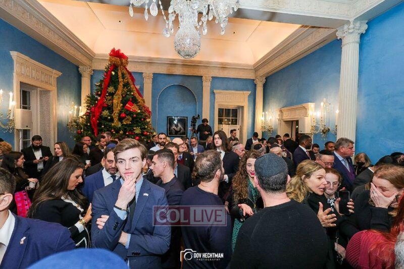 New York City Mayor Eric Adams hosted hundreds of community leaders for a Chanukah gathering at Gracie Mansion Tuesday night where he decried the rise of antisemitism and presented the families of Israeli hostages held by the Hamas terrorists and issued a demand for their release.